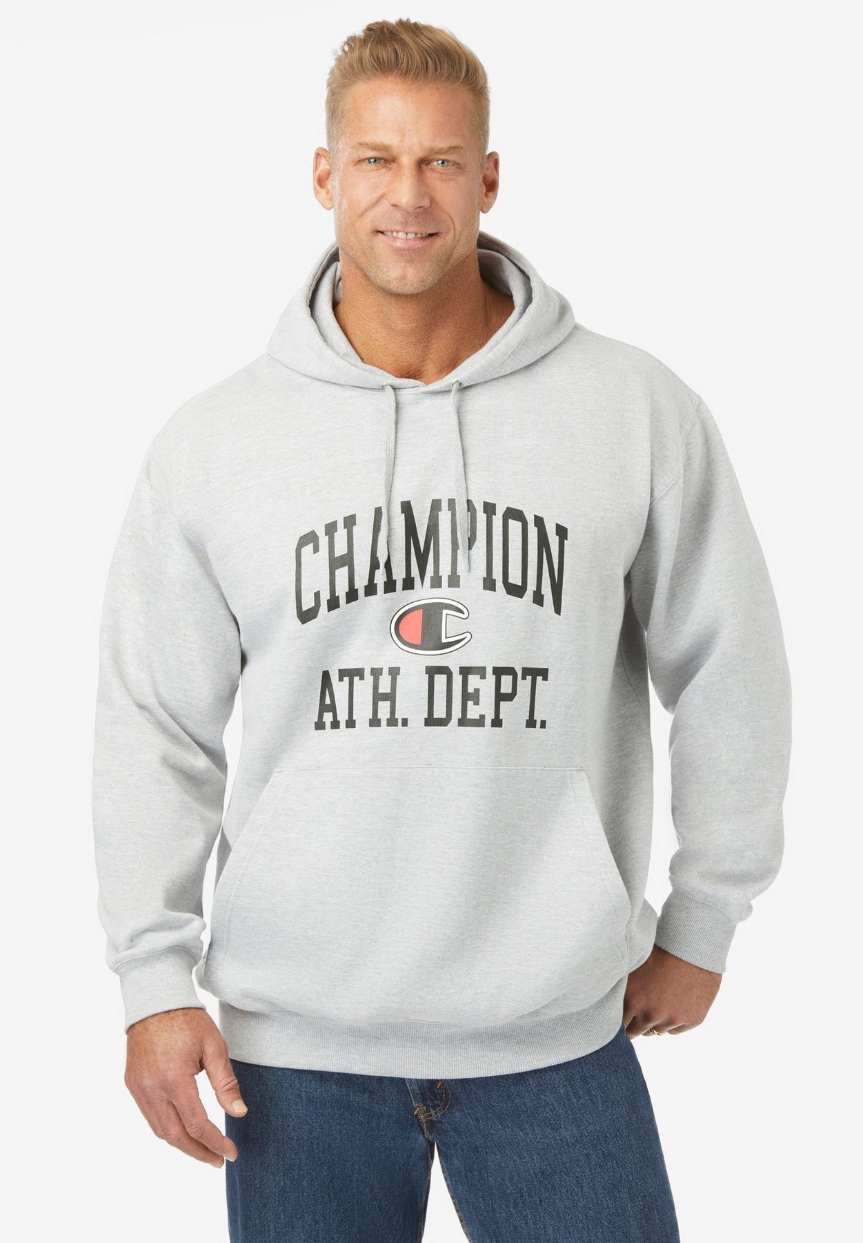 Show off your athletic style in this versatile oversized athletic hoodie by Champion®. This sporty sweatshirt features an adjustable drawstring hood and roomy front pouch pocket to hold your phone and small personal items.