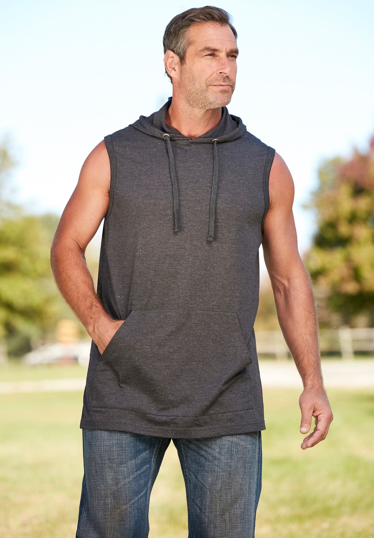 Our muscle hoodie tee is the perfect layer all year long. During warmer months you can wear it alone or as extra layer during cooler month. It has a roomy drawstring hood and pouch pocket that holds all of the essentials.