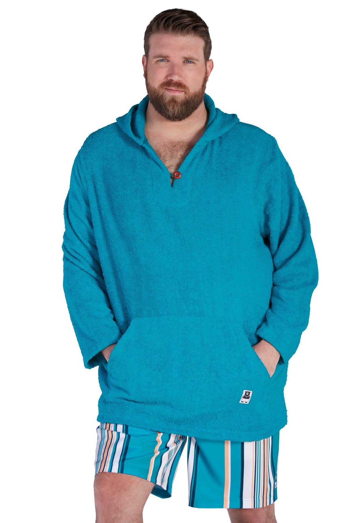 Nice terry hoodie for the pool lake or beachside The top is roomy comfortable like a towel and dries quickly The pullover hoodie with kangaroo pocket fits slightly larger If you go with the next size up the arms maybe a little long Go with your size here Looks great with jeans shorts and of course swimwear The terry lightweight hoodie is soft and durable