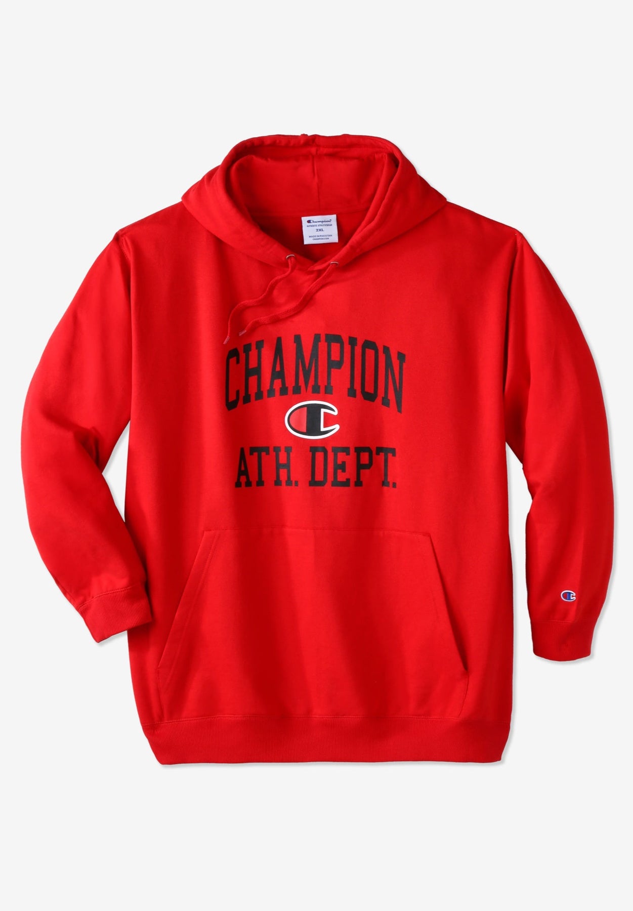 Show off your athletic style in this versatile oversized athletic hoodie by Champion®. This sporty sweatshirt features an adjustable drawstring hood and roomy front pouch pocket to hold your phone and small personal items.