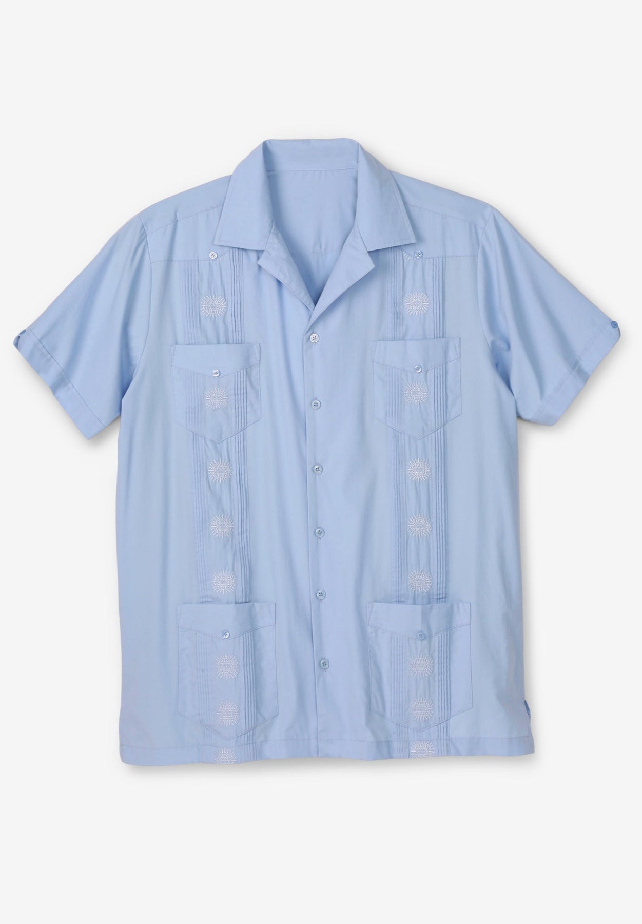 Our Short-Sleeve Guayabera Shirt is a warm weather style at its best. It has a looser fit and is made from a breezy woven cotton blend. Embroidered stitching makes it an eye-catching wardrobe standout.