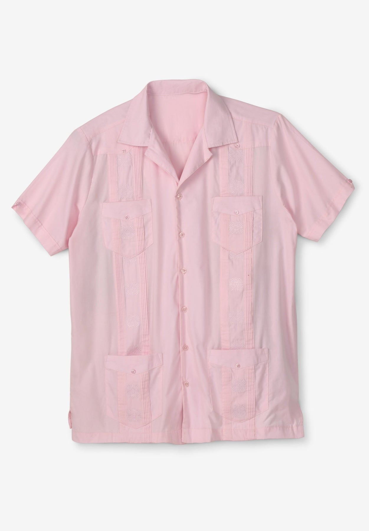 Our Short-Sleeve Guayabera Shirt is a warm weather style at its best. It has a looser fit and is made from a breezy woven cotton blend. Embroidered stitching makes it an eye-catching wardrobe standout.
