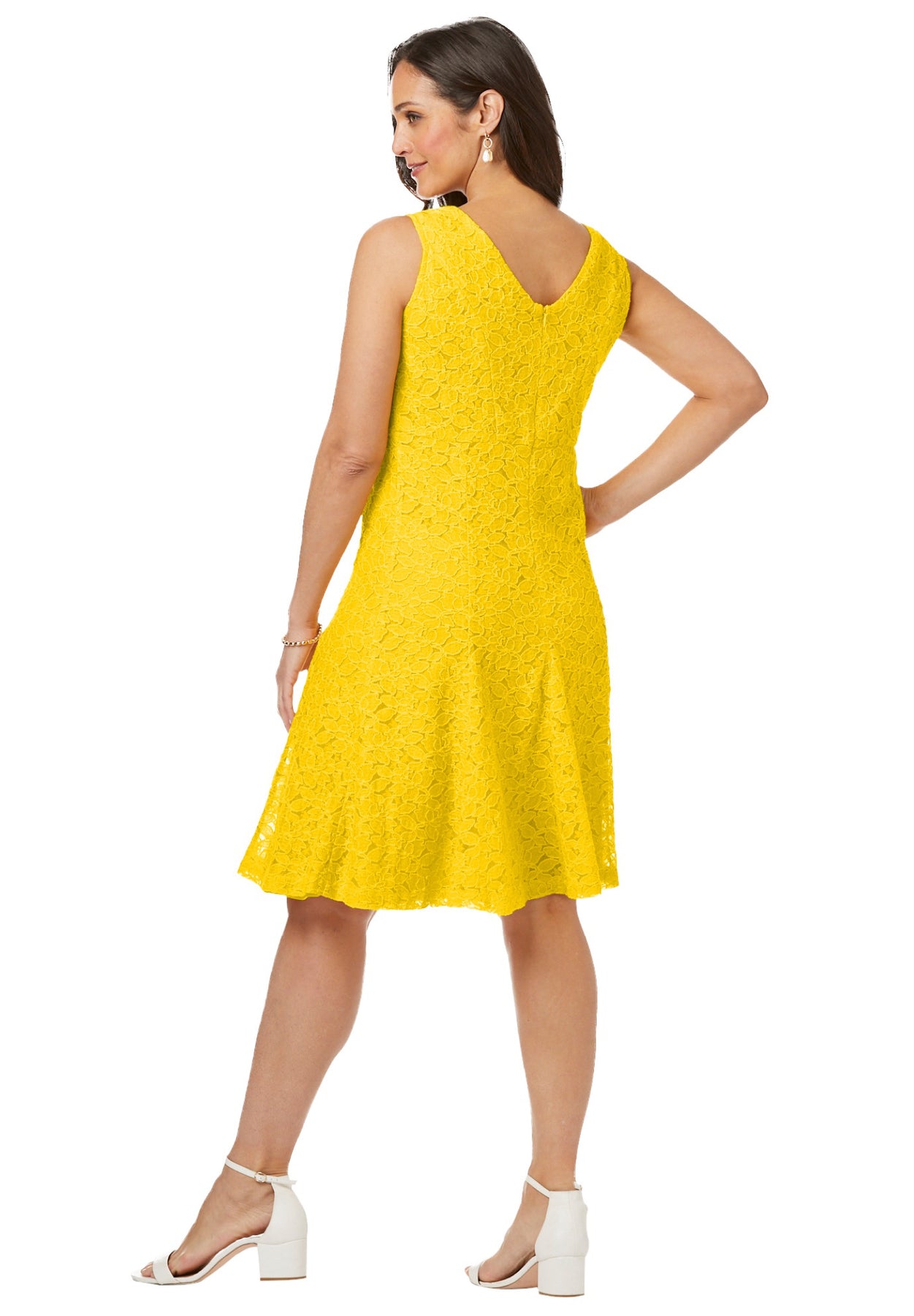 Timeless lace dress shaped with empire and princess seams. Back zip with hook-and-eye closure.
