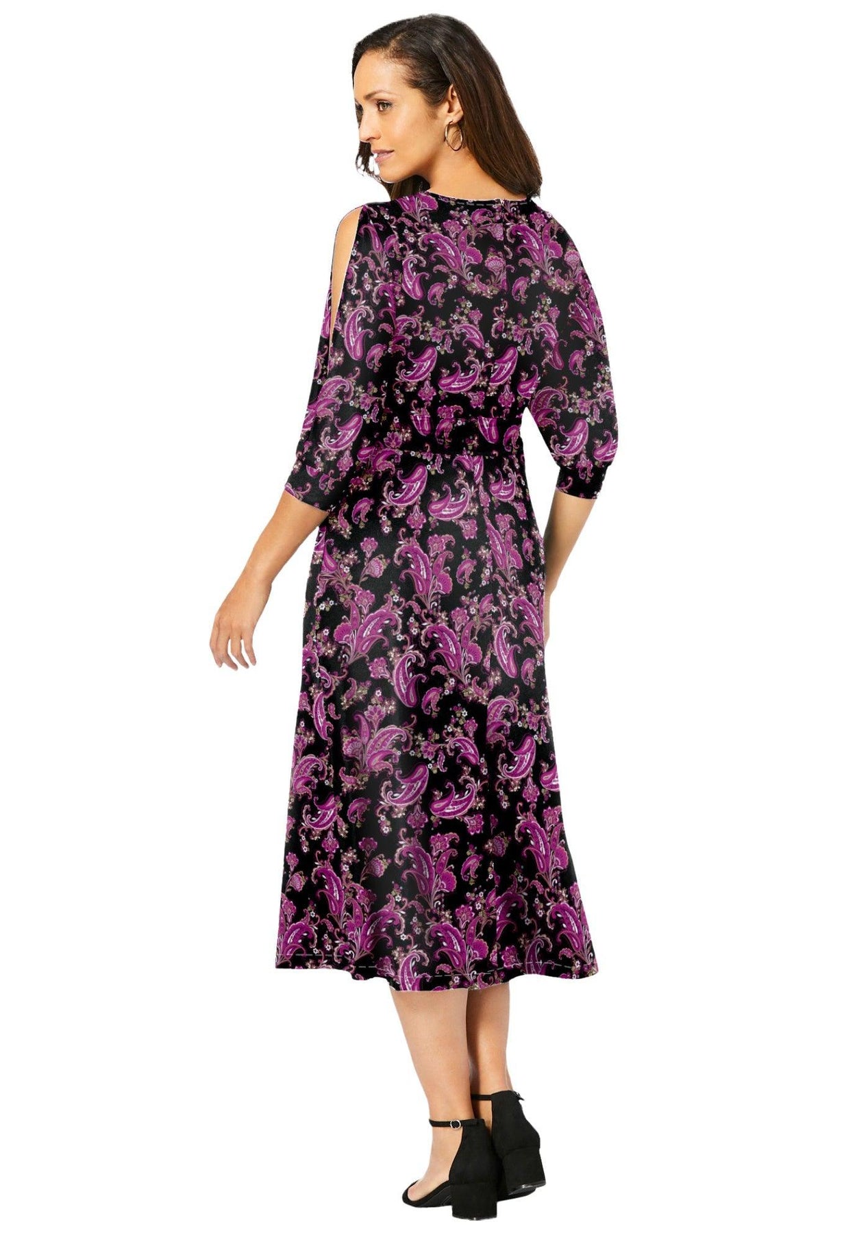 This feminine and flirty midi dress features an empire waist that flatters your figure with shirring at both sides. Full skirt. Three-quarter length blouson sleeves with slits. The stretch jersey knit drapes beautifully, keeps its smooth shape wash after wash, and packs without wrinkling.
