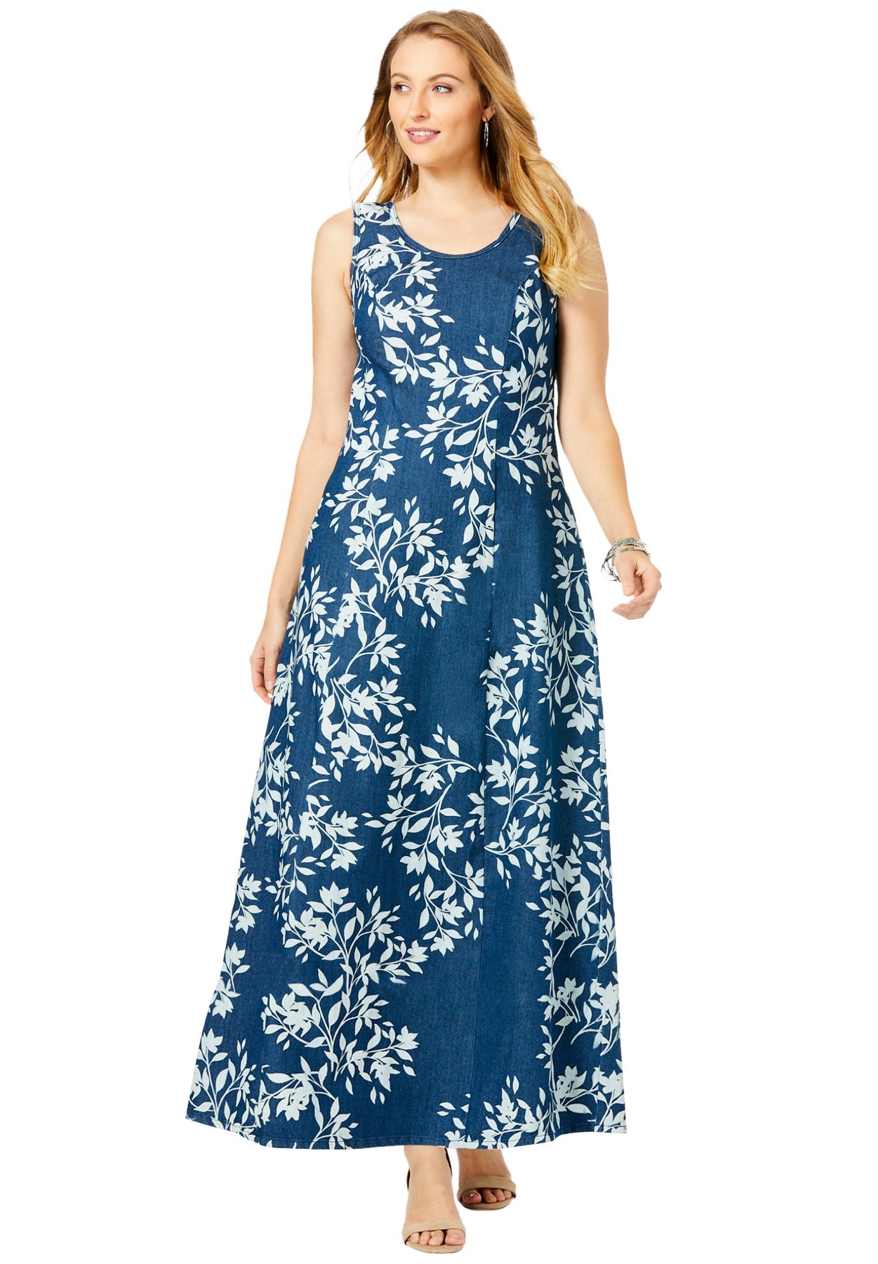 This modern take on the long dress gives you a sweeping silhouette in timeless denim. Pair with a pair of wide calf boots and a shrug for fall. Wear in warmer weather with sandals – we suggest espadrille wedges.