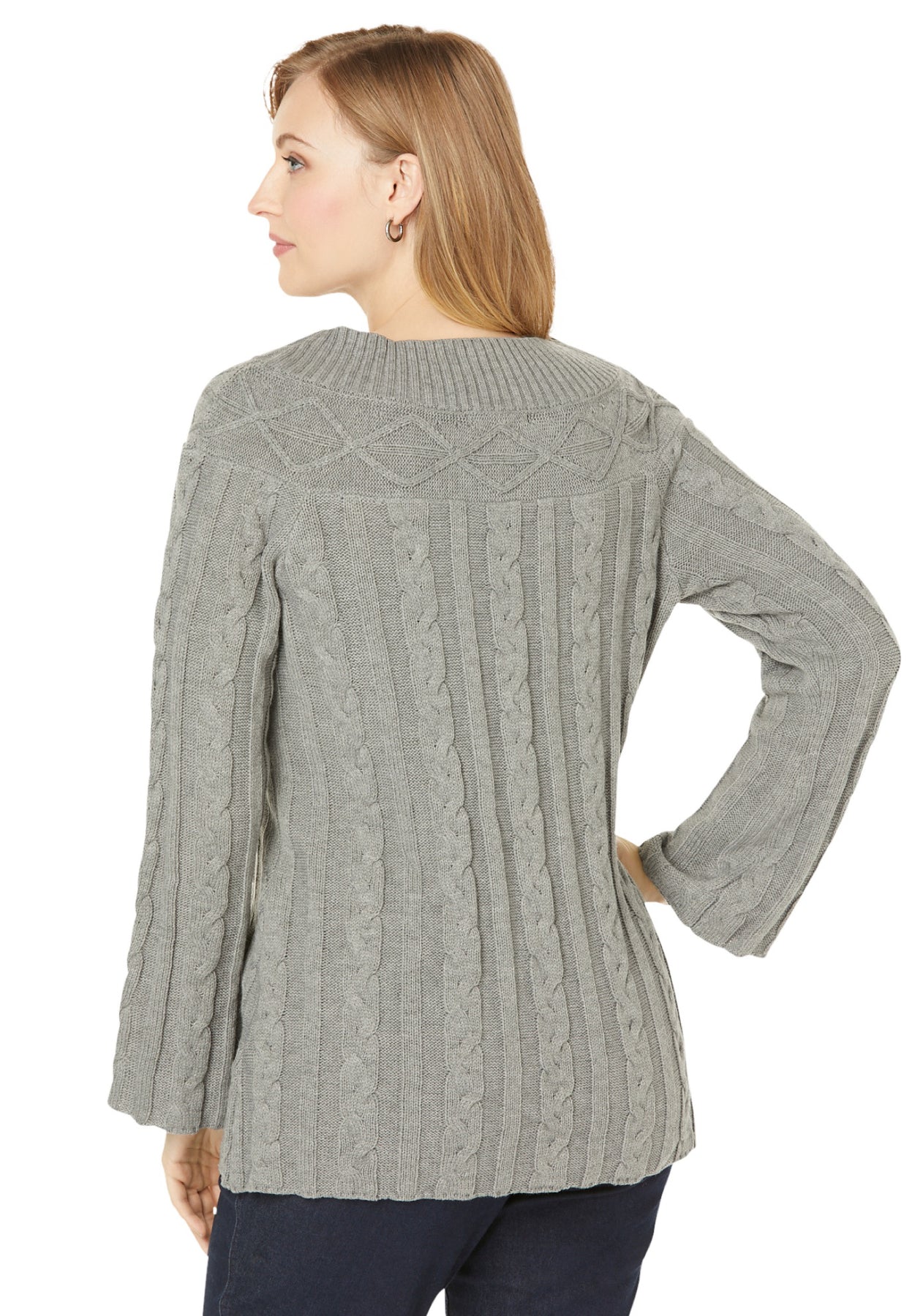 This classic cable knit sweater gets a modern update with a slightly flared silhouette that is fit to flatter every body. The beautiful boat neckline is perfectly proportioned to smartly conceal bra straps and the longer, tunic length eases over everything in your fall-forward wardrobe. Dress it up with slacks and a polished pair of pumps, or keep your look casual in denim and flats - no matter how you wear it, this tunic is a must-buy!