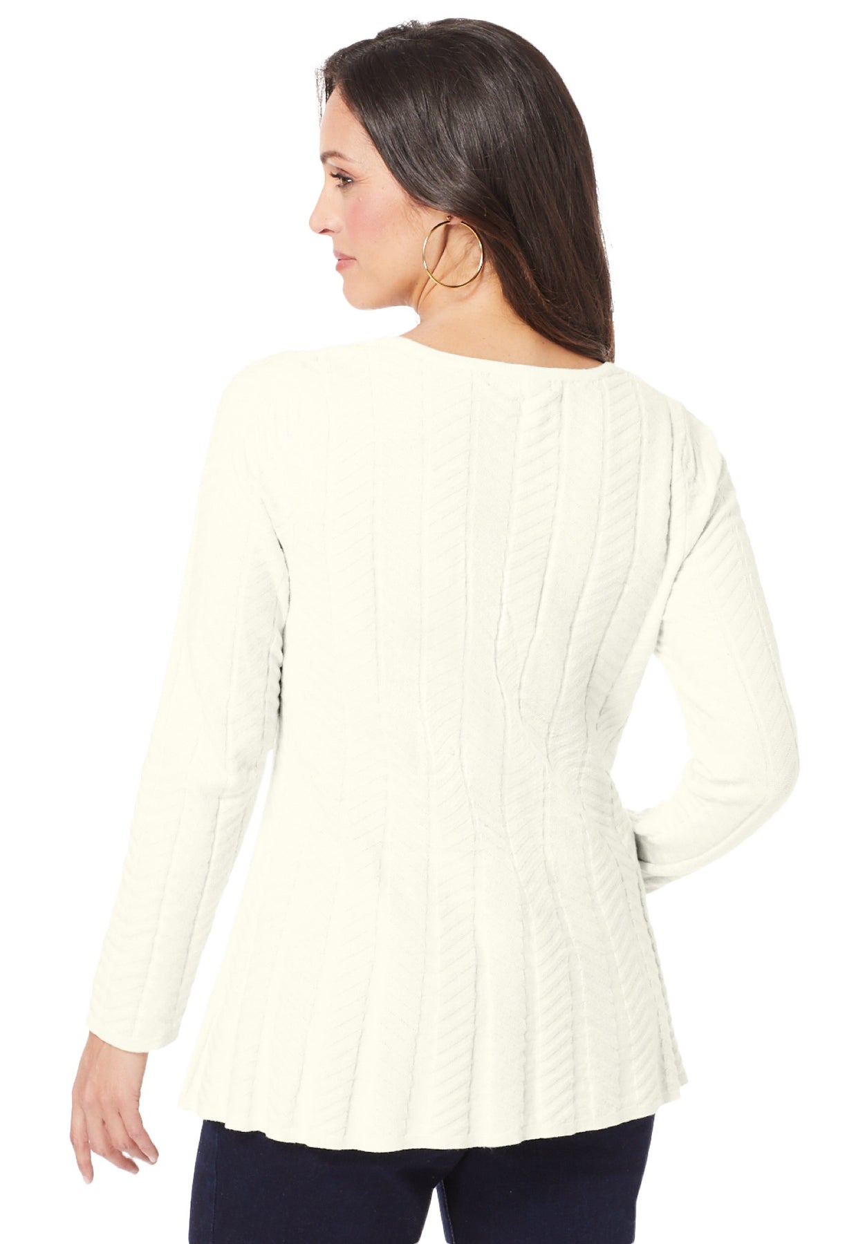 A fabulous fit & flare silhouette and textural cable knit detail gives this sweater a casual-chic look that you will love. The scoop neckline is perfectly proportioned to smartly conceal bra straps and the slight peplum-shape offers a breezy feel that eases over everything in your fall-forward wardrobe. Just add booties and your favorite accessories!