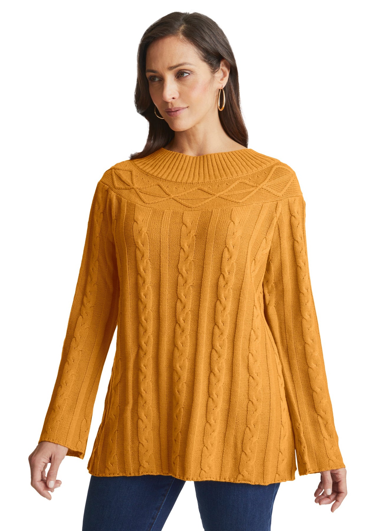 This classic cable knit sweater gets a modern update with a slightly flared silhouette that is fit to flatter every body. The beautiful boat neckline is perfectly proportioned to smartly conceal bra straps and the longer, tunic length eases over everything in your fall-forward wardrobe. Dress it up with slacks and a polished pair of pumps, or keep your look casual in denim and flats - no matter how you wear it, this tunic is a must-buy!