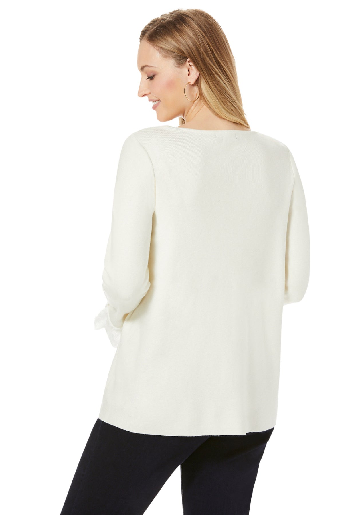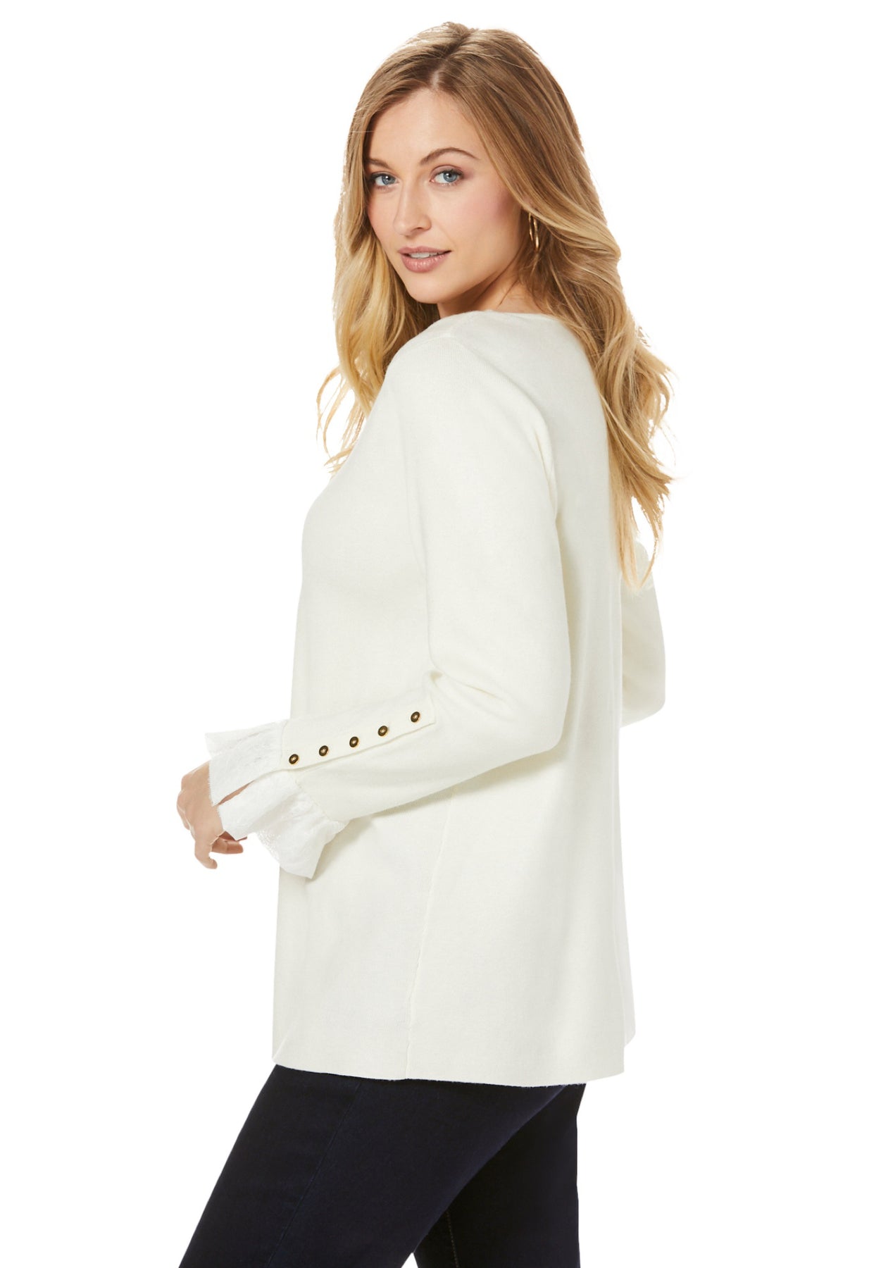This classic pullover gets a feminine makeover with lace bell cuffs and Georgette underlay, plus goldtone buttons on the bell sleeves. The scoop neckline and relaxed silhouette make this a comfy-meets-chic choice for on-the-go style.