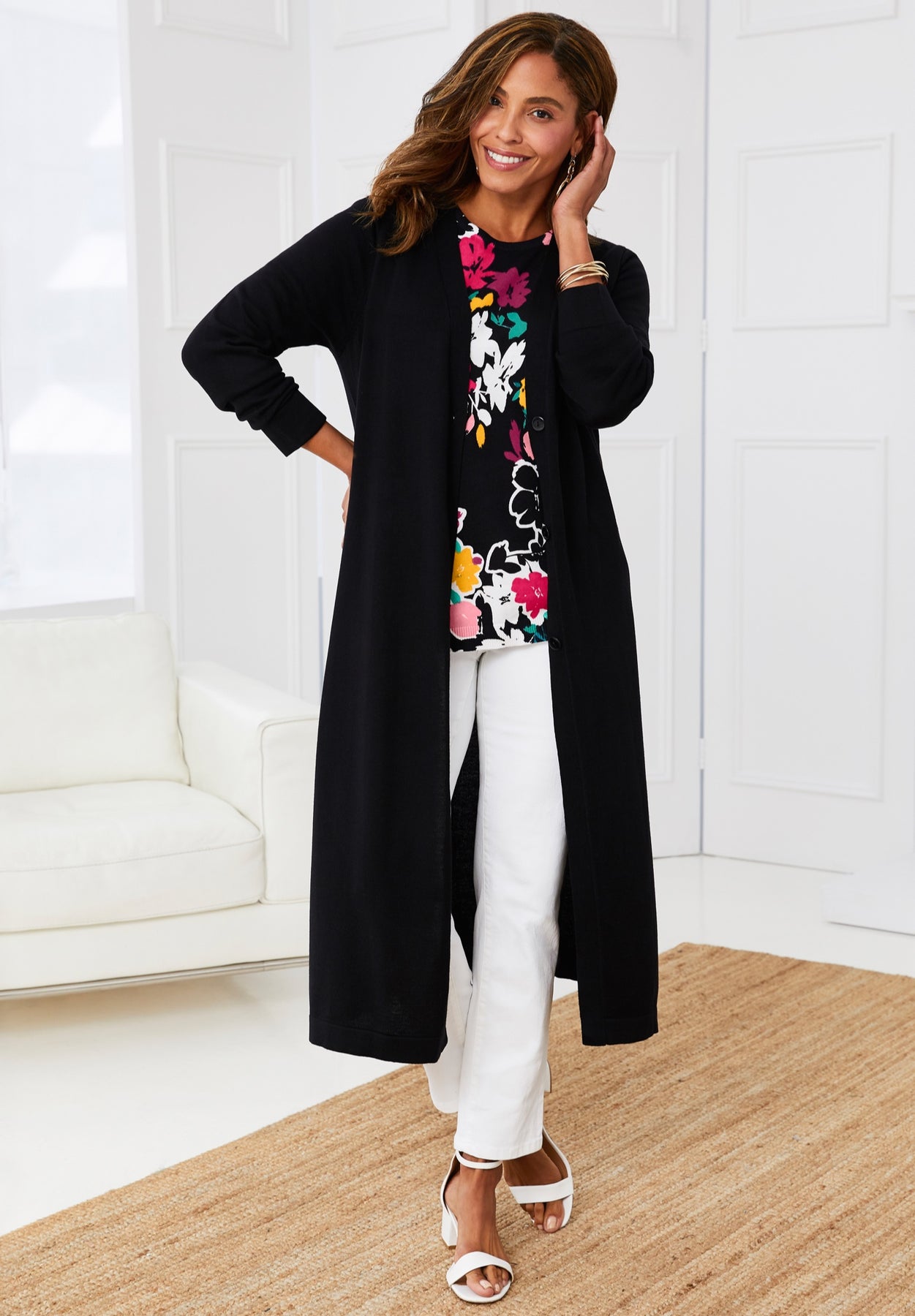 A lightweight classic with a look of pure luxe, this long cardigan is a must-have throw-on-and-go layer. Pair it with our fine gauge shell & trousers to finish your 9-to-5 look.