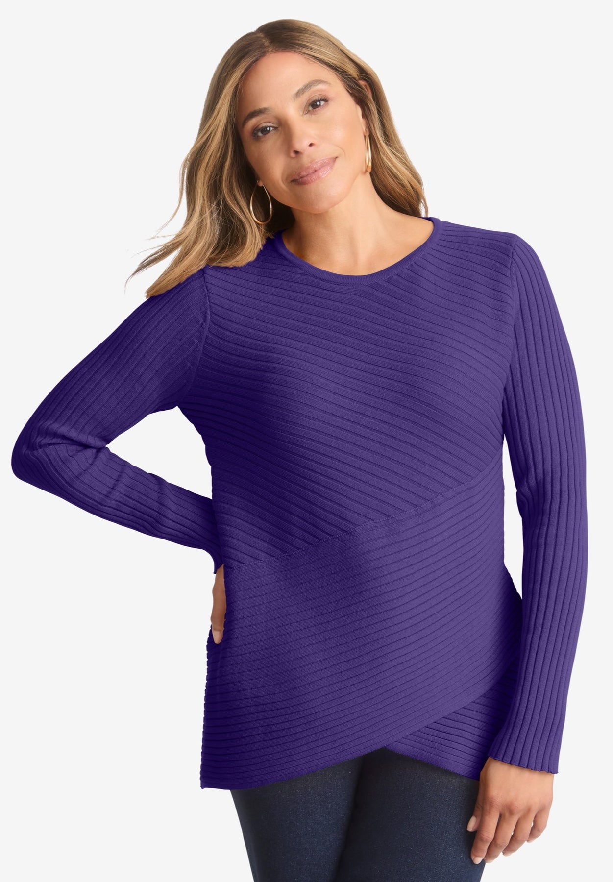 A cozy must-have for cold weather dressing! Soft and figure-flattering, this classic sweater is crafted with a front crossover detail. Wear it with jeans and boots for a look that goes everywhere!
