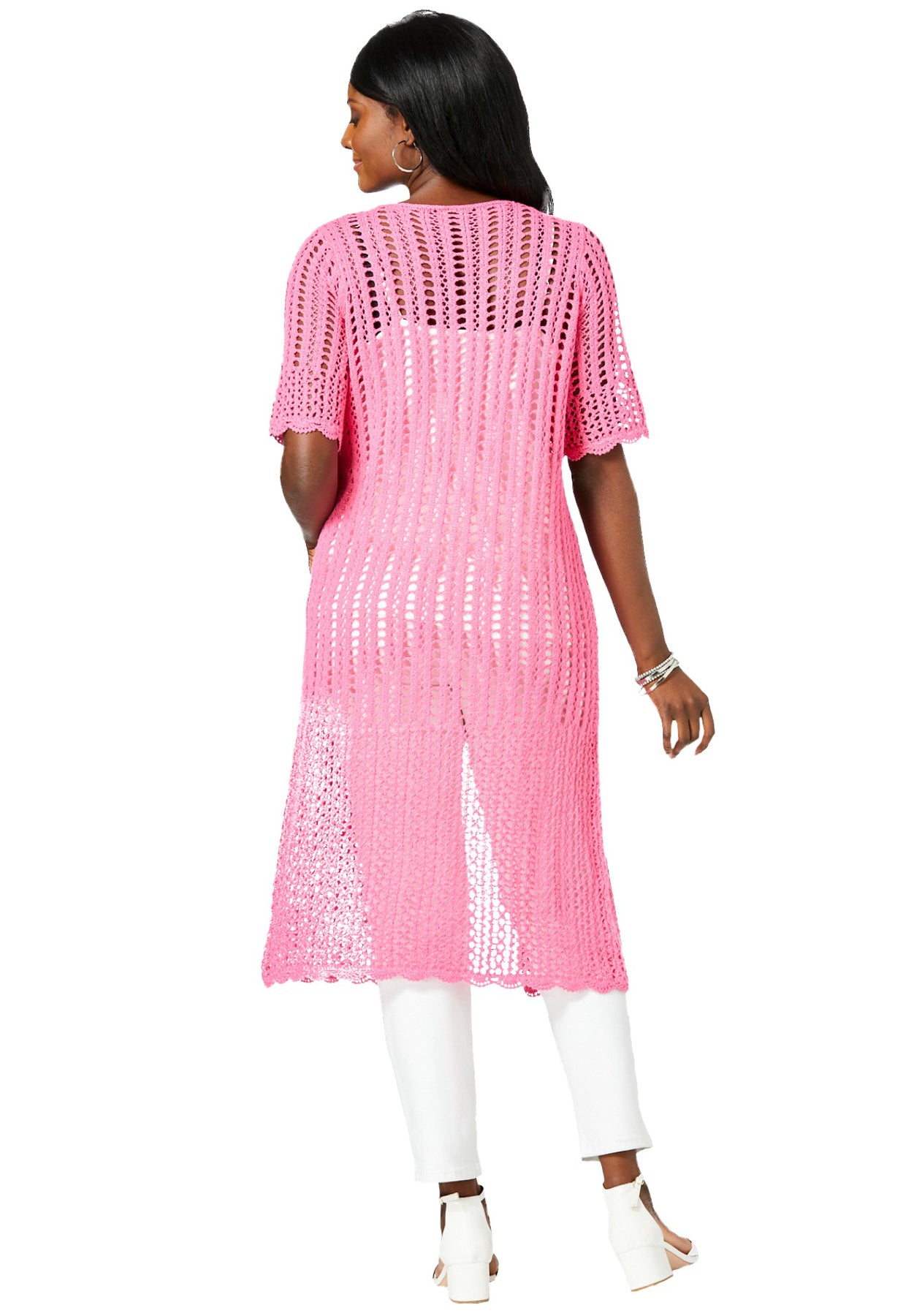 Perfect for your off-duty style, this crochet sweater duster features an open front for a comfortable, relaxed fit. The elbow length sleeves have a scalloped hem for a feminine look that is always on-trend.