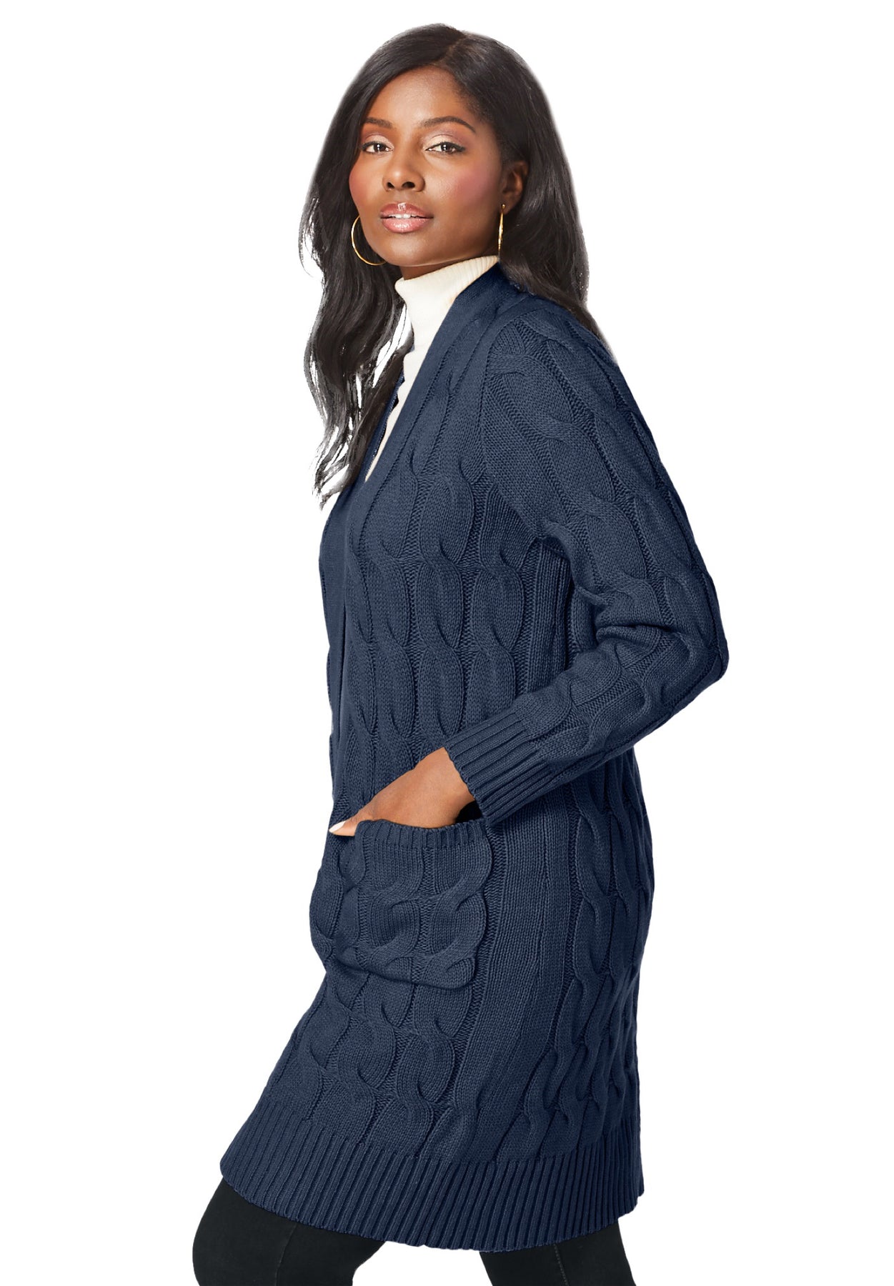 With a relaxed, figure-flattering fit, the Jessica London women's plus size Cable Duster Cardigan Sweater effortlessly pairs over everything in your wardrobe. The cable knit detailing adds a soft, textural touch while the shawl collar lends eye-catching appeal.