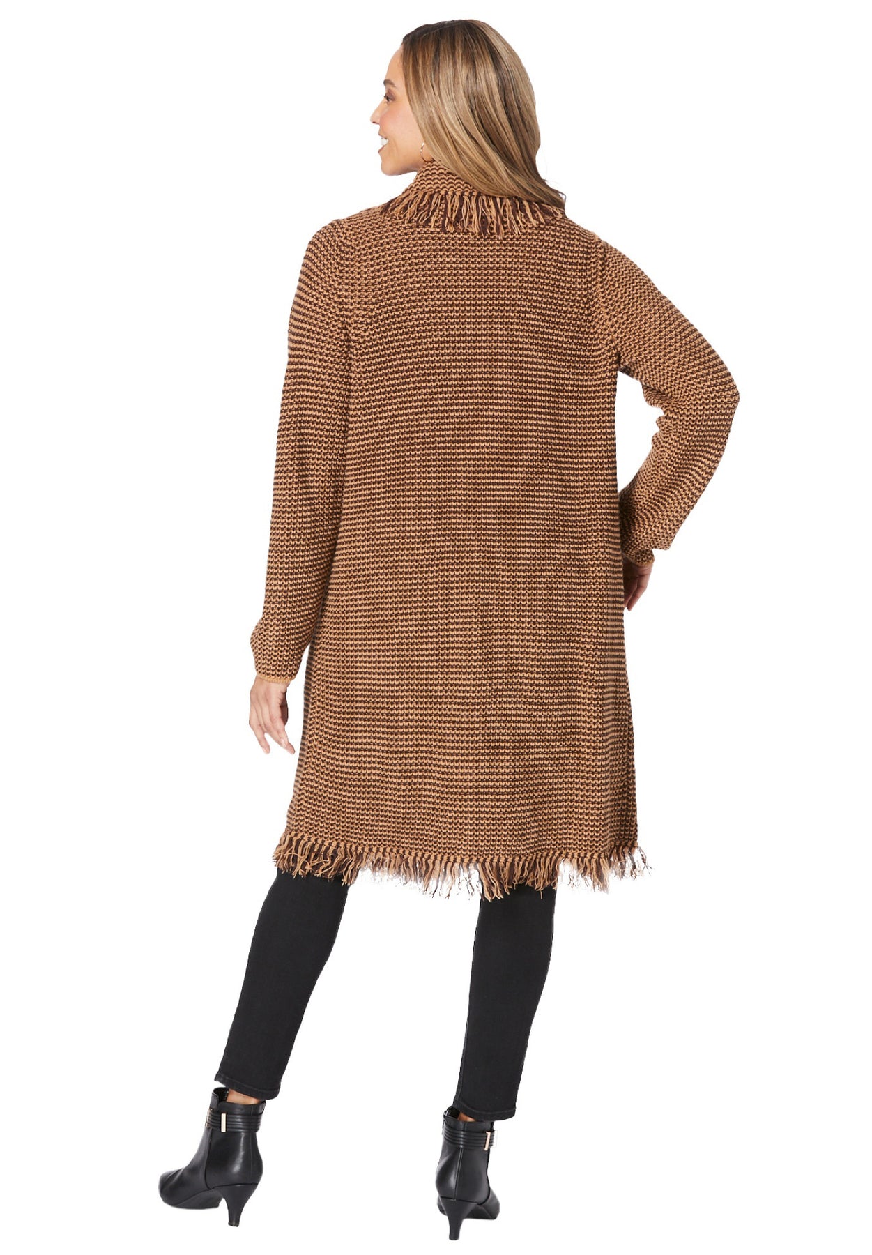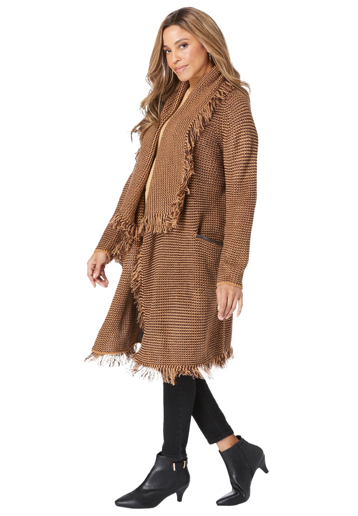 - Fringe detail around the shawl collar and hem
