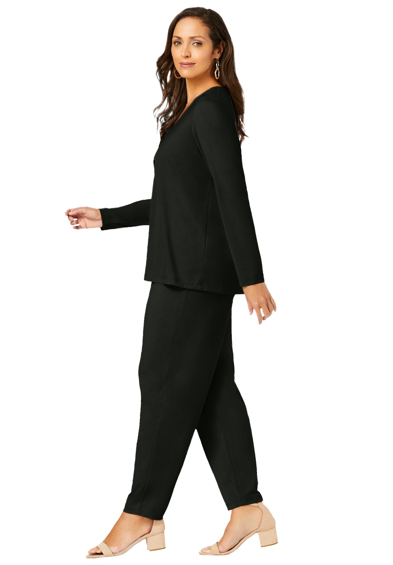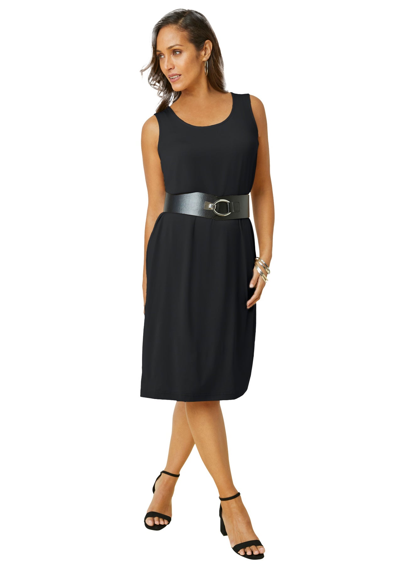 Meet the Jessica London women's plus size 4-Piece Stretch Knit Wardrober from The London Collection — it's your own curated capsule collection! Includes a tank, straight-leg pants, collarless jacket and scoop-neck dress for endless styling options. The stretch jersey knit drapes beautifully, keeps its smooth shape wash after wash, and packs without wrinkling.