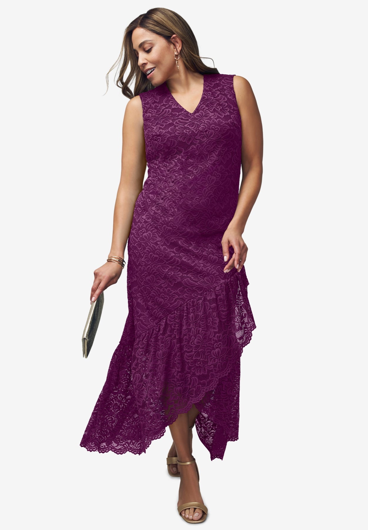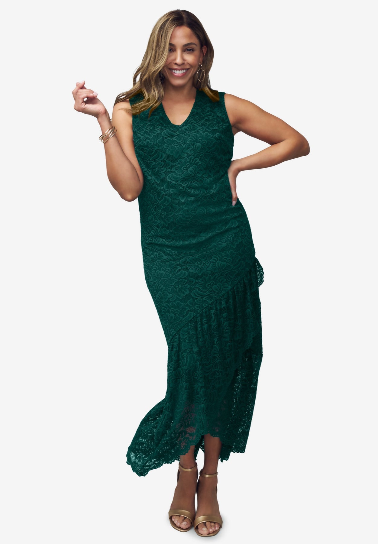 This lace look always delivers on head-turning style. A sophisticated shrug jacket with sweet scallop details layers over an elegant maxi dress with a hi-low hem that feels tailored for you.