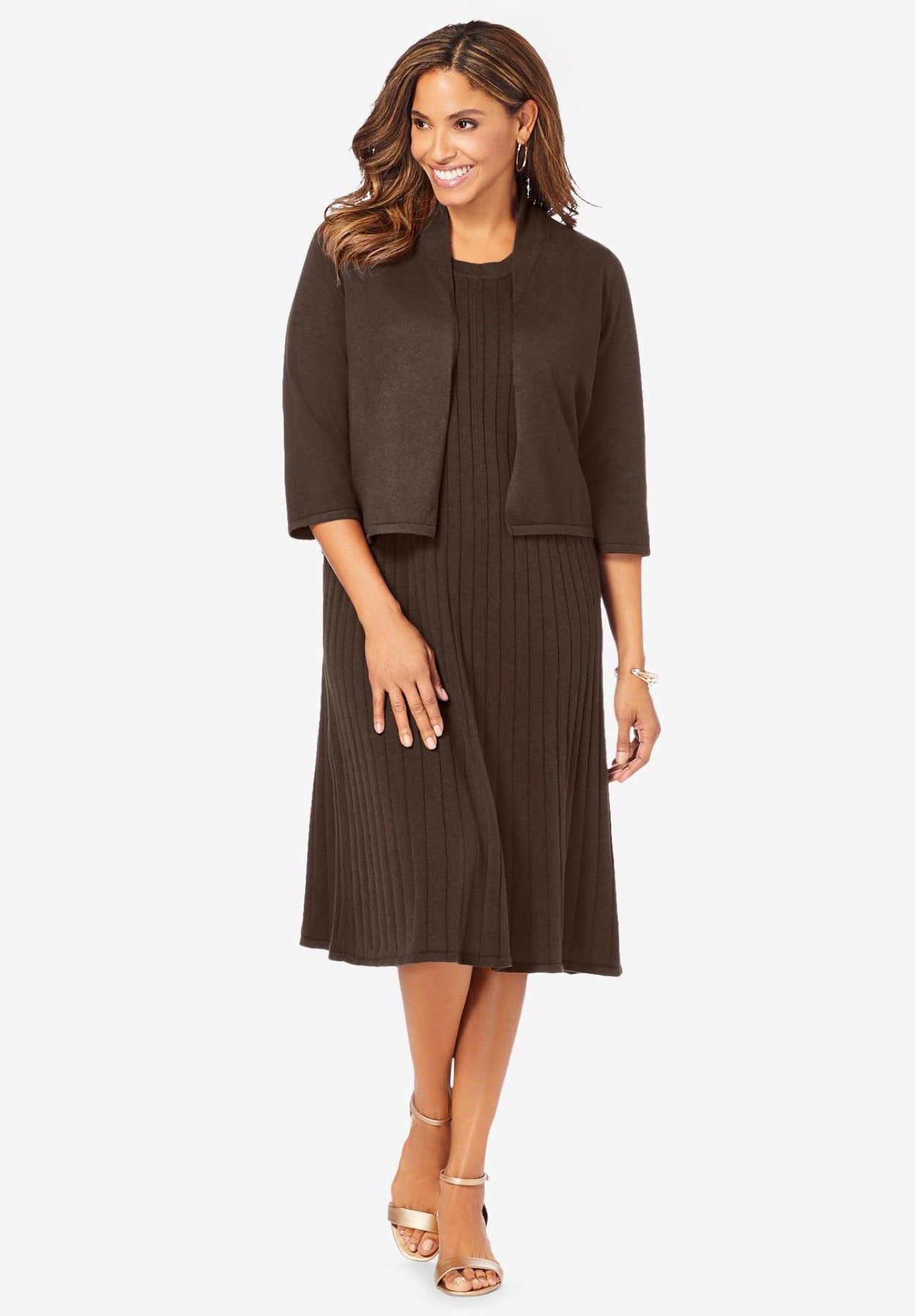 An effortless two-piece sweater set for fall-forward style. Dress boasts a fit & flare silhouette. Crop jacket with three-quarter length sleeves.