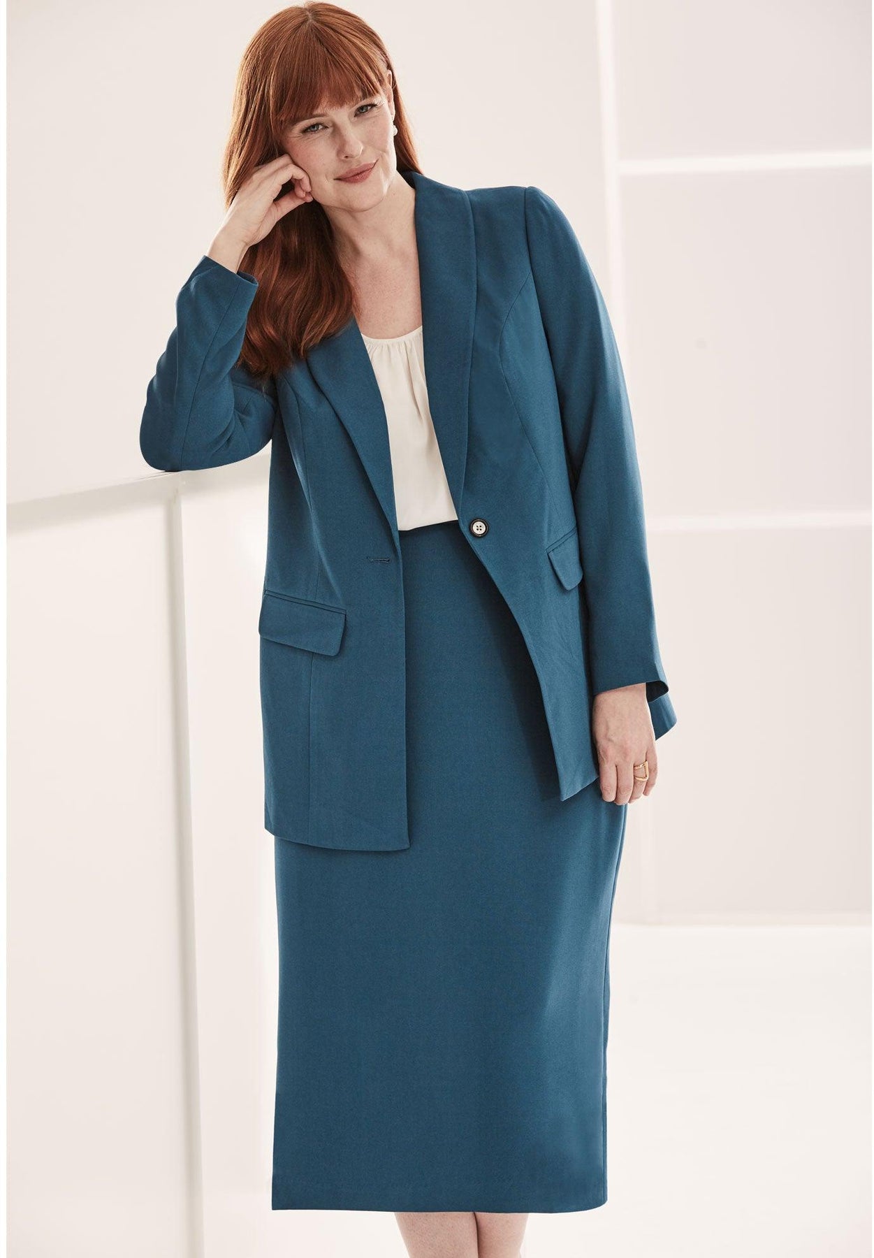 The crepe texture of this skirt suit gives it a sophisticated yet chic look. Shawl collar with single-button closure. Princess seams and waist darts. Fully lined. Flat-front skirt with contour waistband with back elastic. Back button-and-zip closure, back walking vent. Textured crepe.