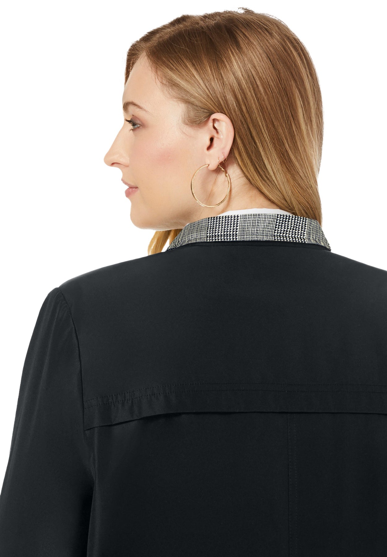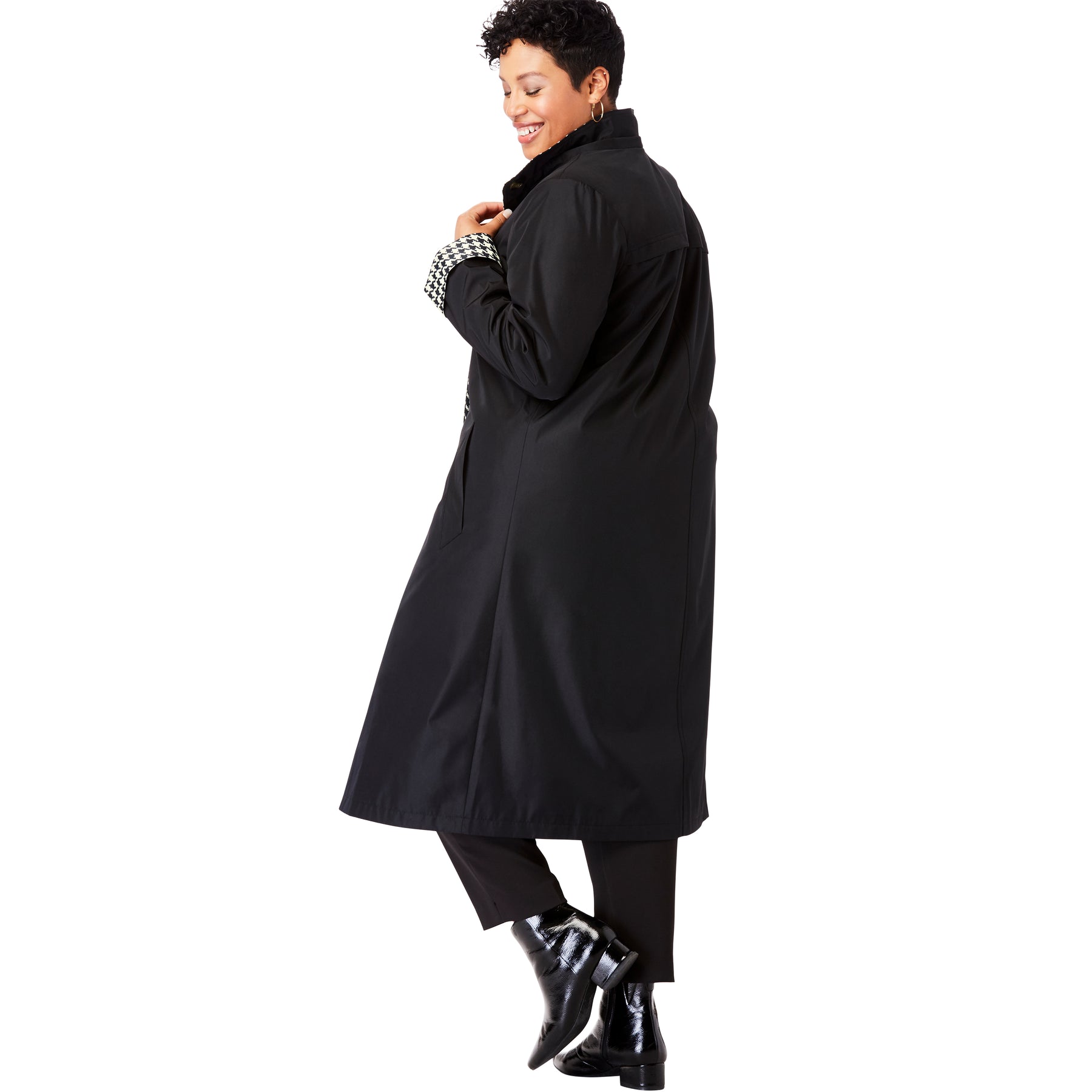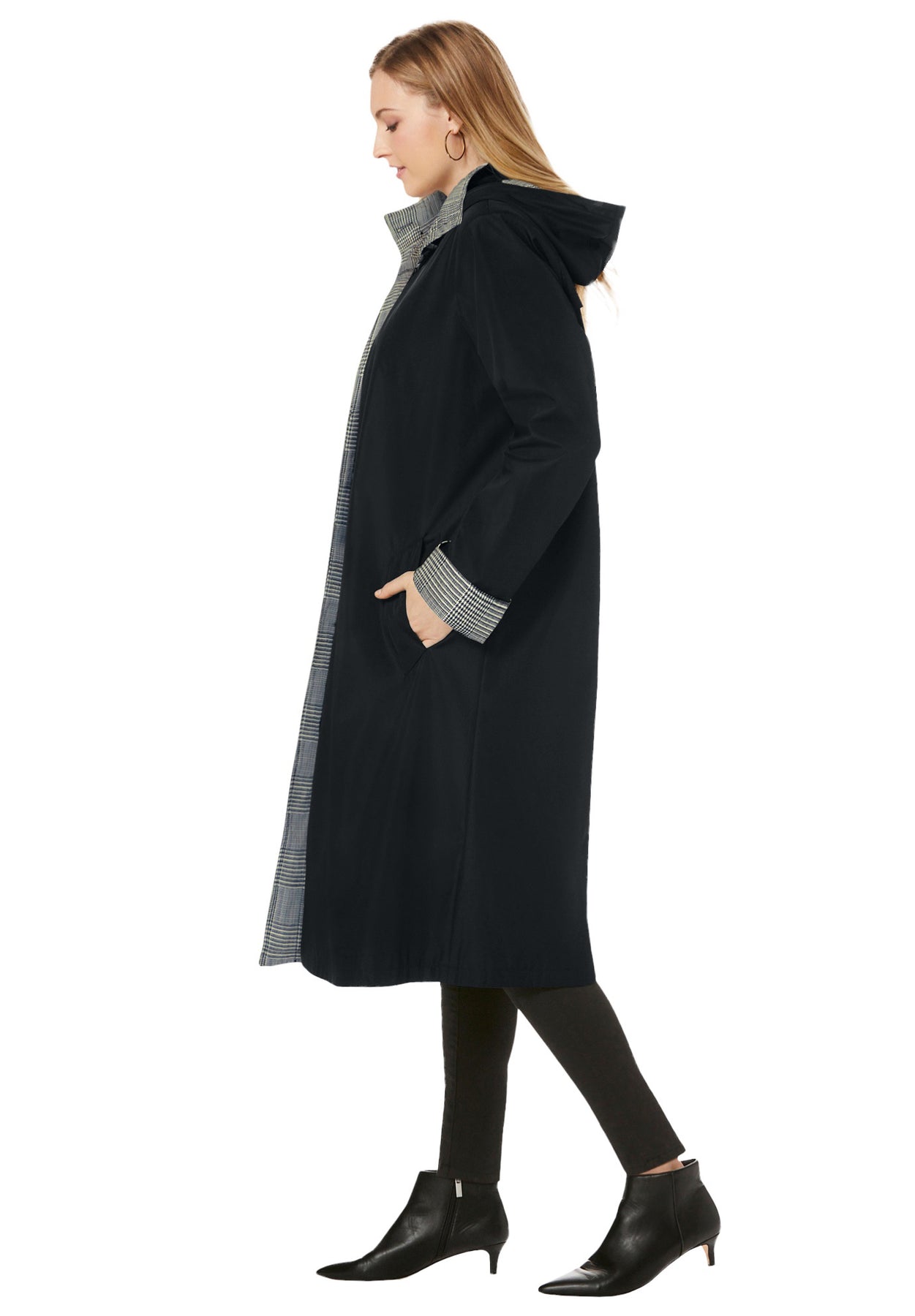 A versatile coat for rain or shine with a detachable button-off hood. Hidden button placket. Side slash pockets. Water resistant.