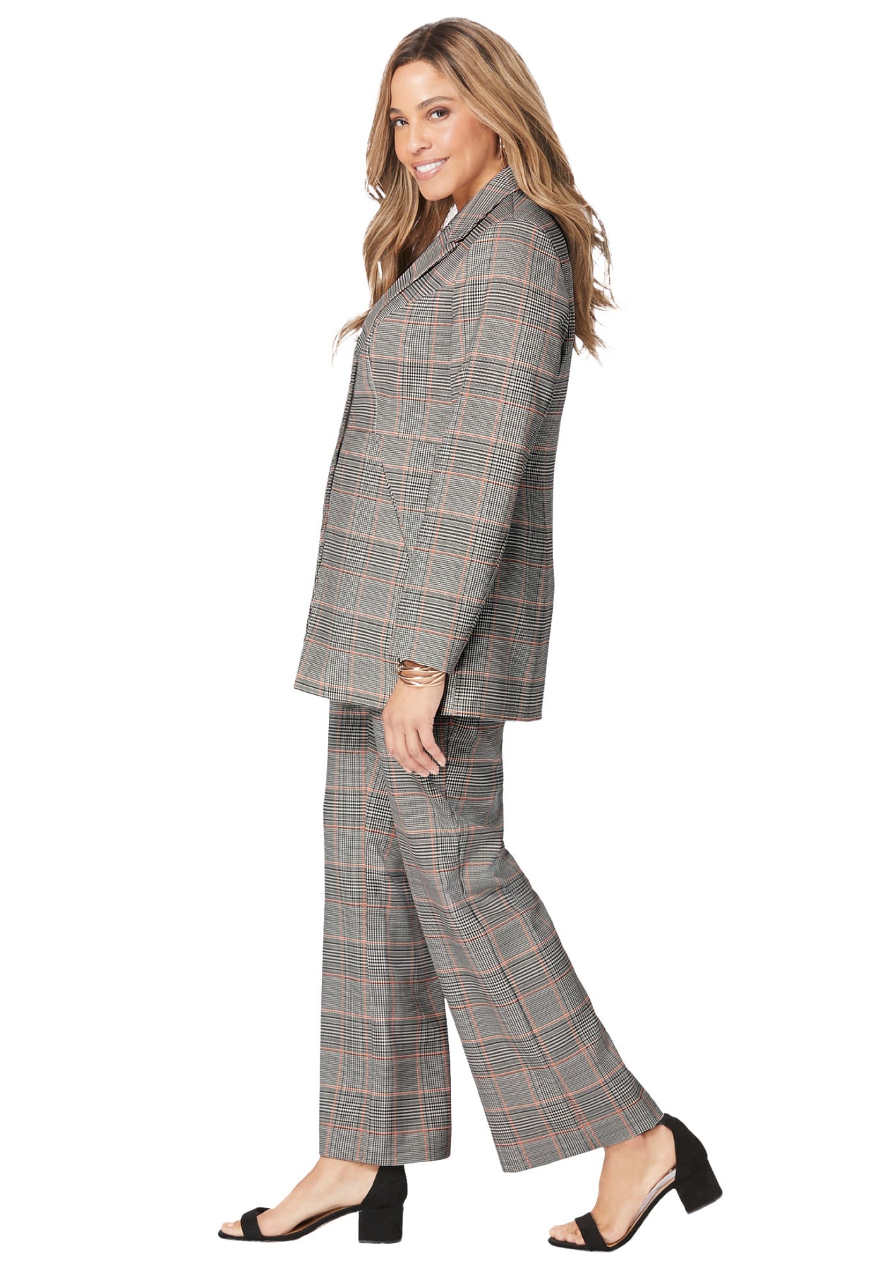 I love this blazer style and material match the bend over pant perfectly both fabric and colors However it does run small I even ordered up a size to a 28W after having read the reviews and it is still too small I chalk this up to my being top heavy 48 DDD so the jacket does not button comfortably since it does not sit where it is supposed to Still looks nice if I wear it open It does not cover a big stomach but if you have a narrow waist and are just large chested it will work A 30W would have made the shoulders arms and waist all sloppy big on me I kept it since it matched my bend over pants so perfectly I love the look I have blousey shirts that cover the big stomach or at least cover it enough to put me in my comfort zone as to my appearance I really love the suit Bought two more colors