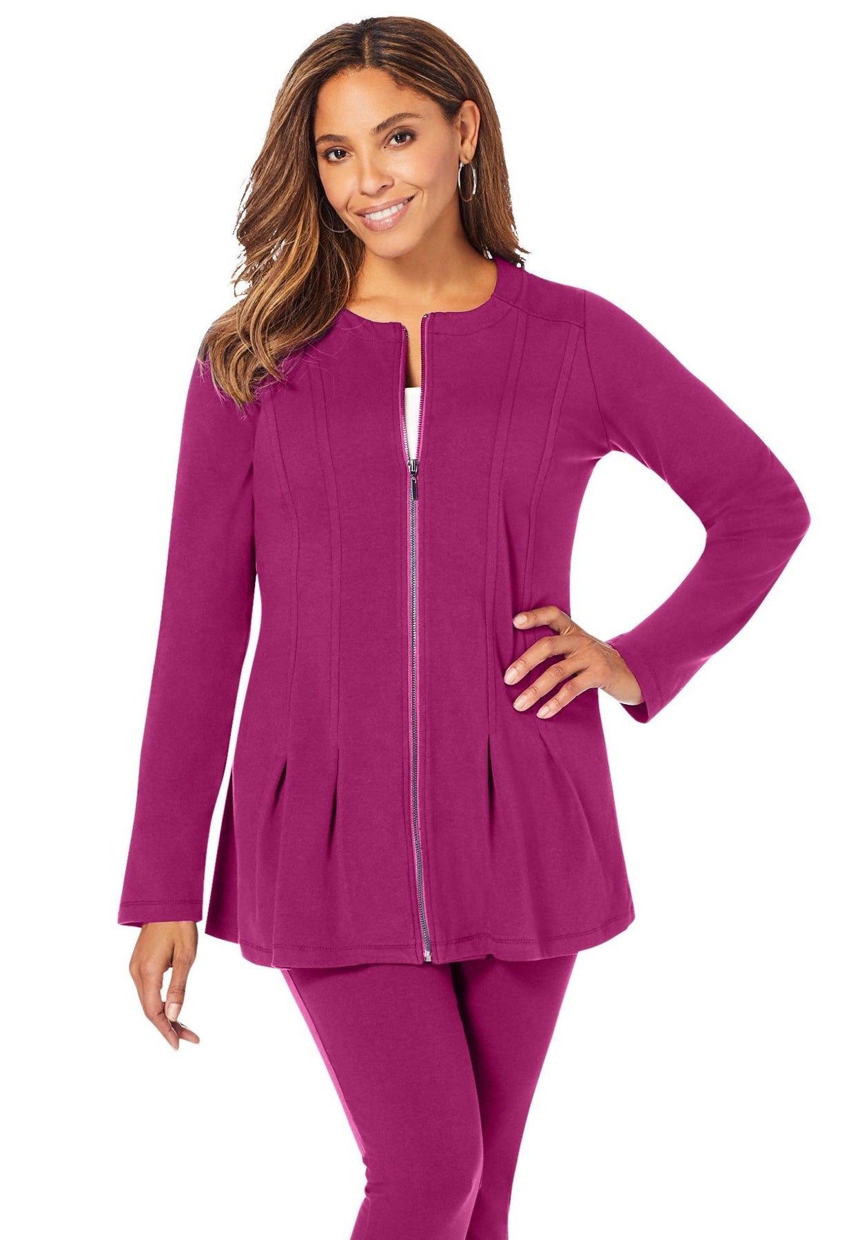 Very nice comfortable jacket perfect weight for fall and spring and perfect match for wearing with leggings or a skirt or jeans and your favorite blouse or top