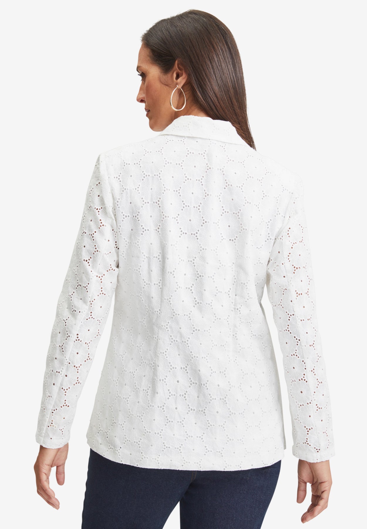 An elegant, all-over eyelet blazer with scalloped sleeve edges gives your look a feminine finish. Layer over a colorful top and your favorite jeans for an outfit that flatters all day long.