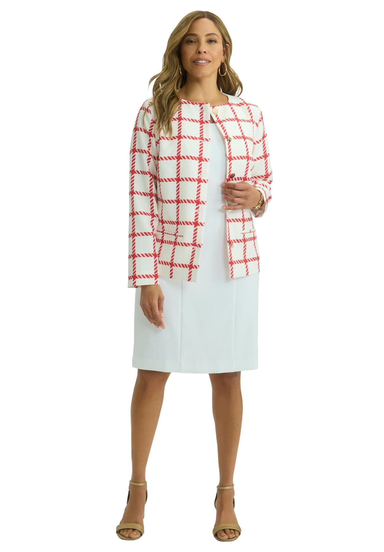 The name says it all! This chic and sophisticated silhouette is a must-have for updating your workwear this season. The collarless design adds a feminine touch to classic suiting. Layer it over our Bi-Stretch Sheath Dress for a flawless look that will take you from commute to cocktails.