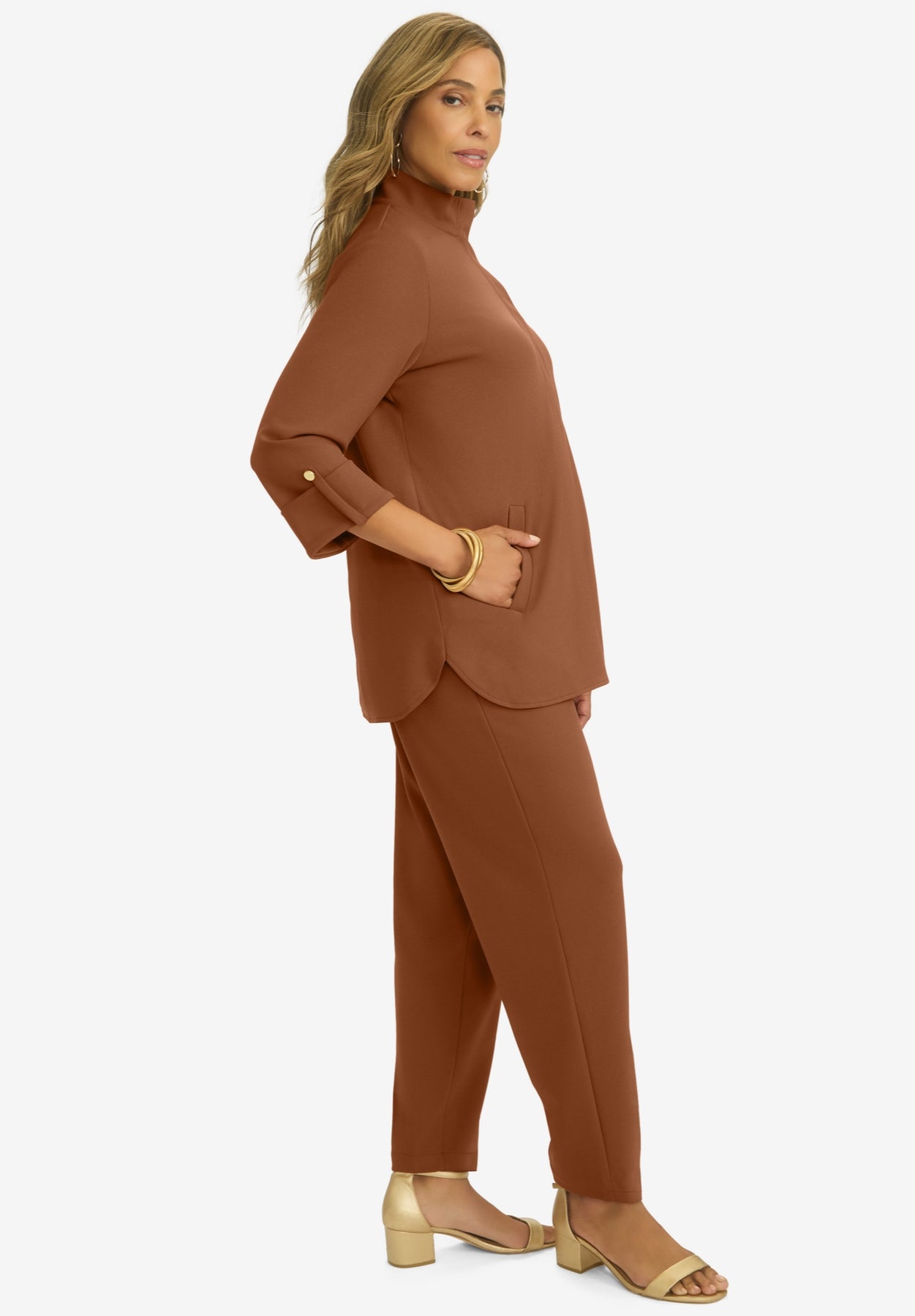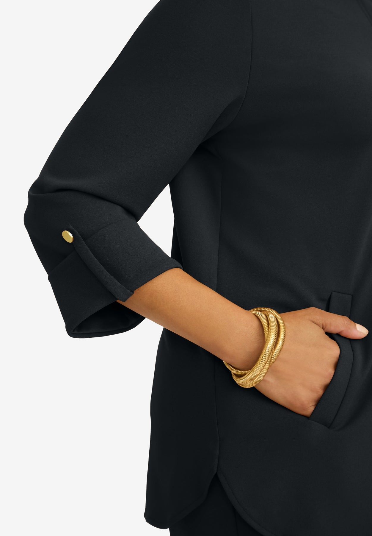- The Top: Zip-front winged collar; A-line silhouette with curved hem; three-quarter sleeves. 30" length.