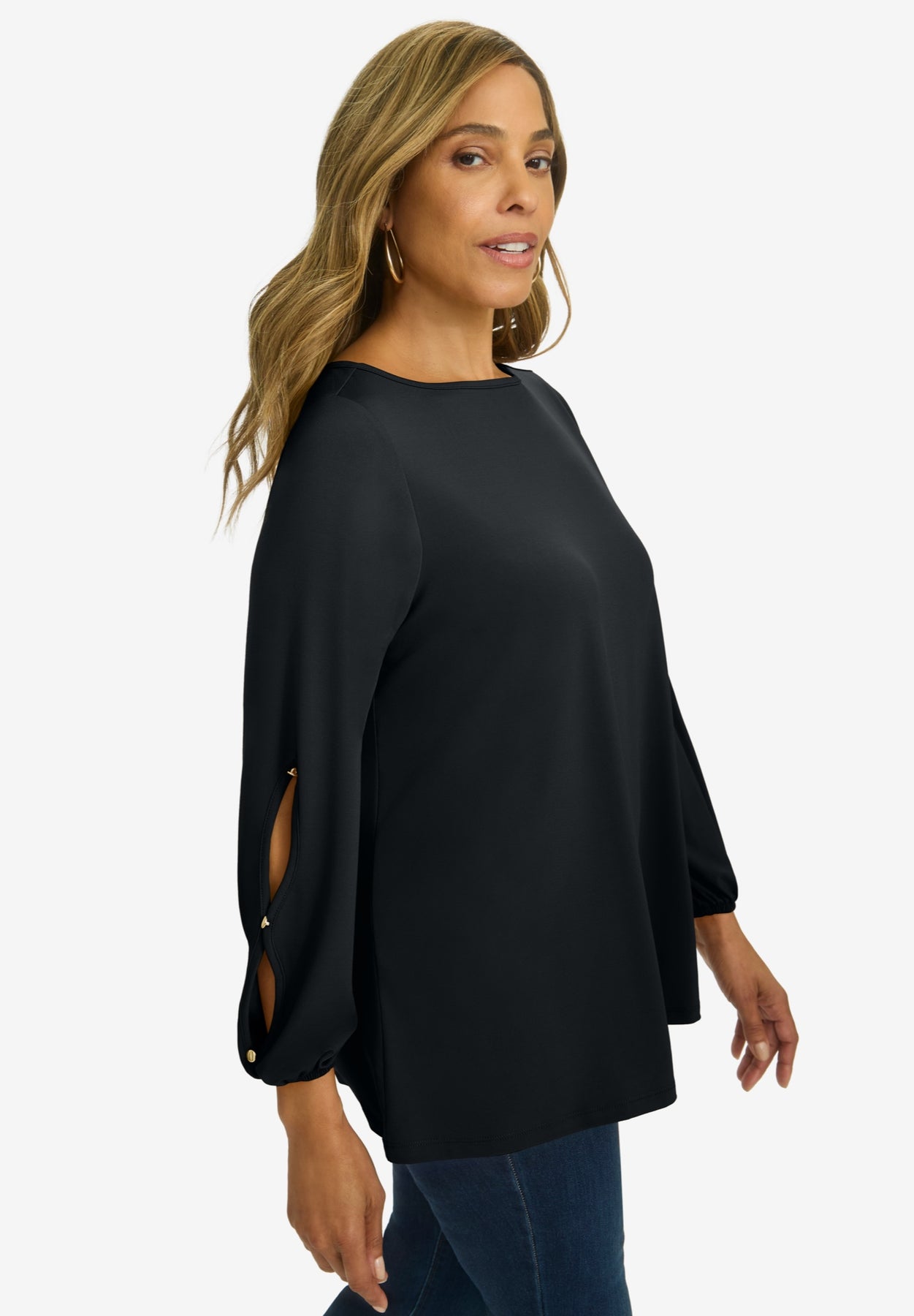 • Long blouson sleeves with slit cutouts, three gold non-functional buttons