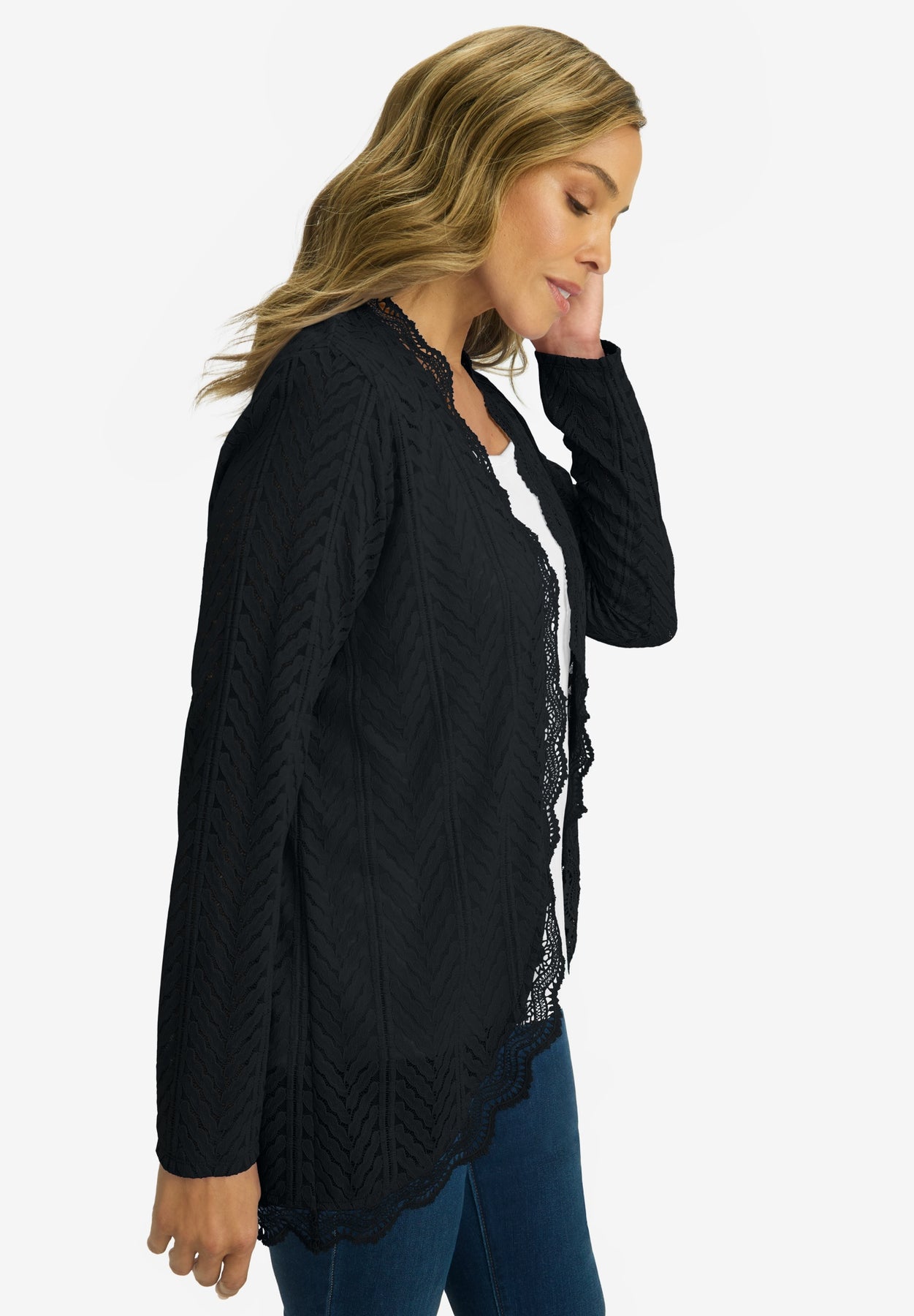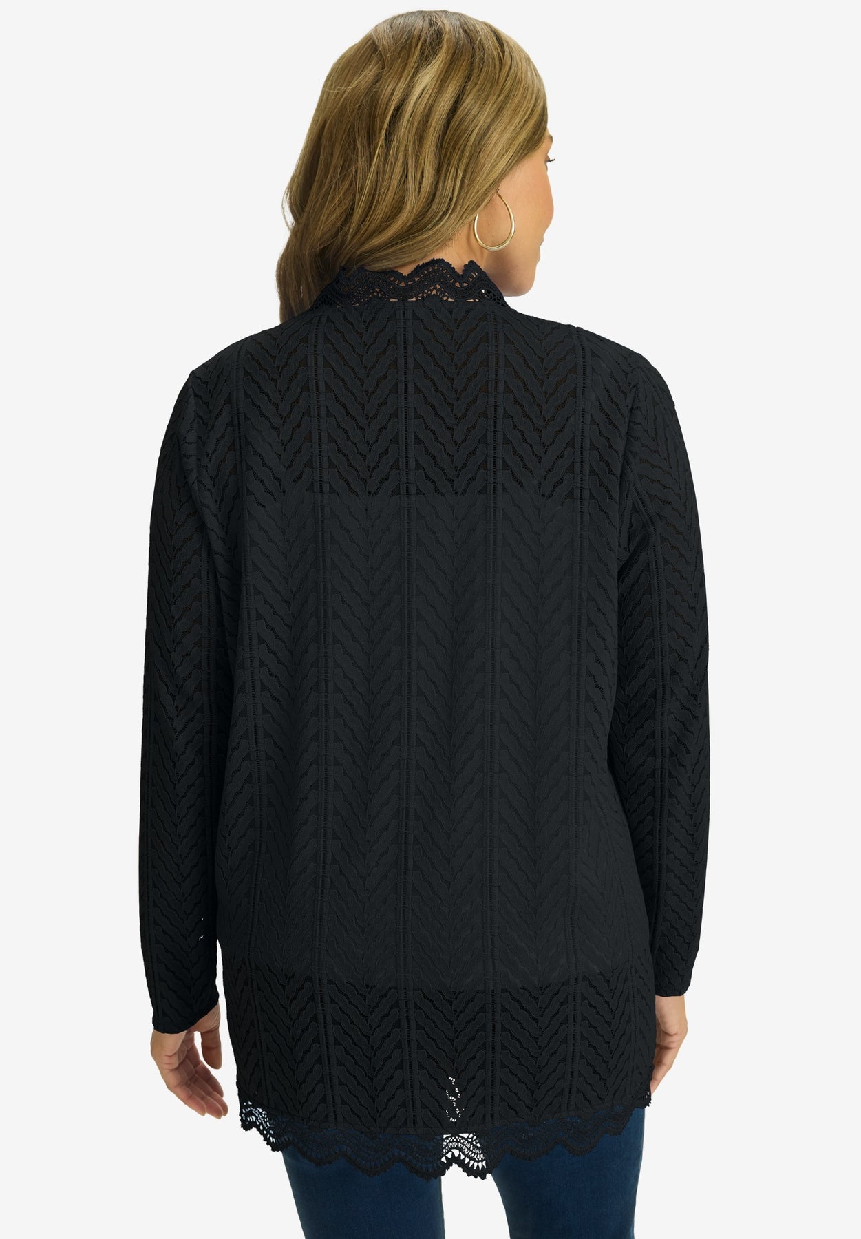 Every outfit needs the perfect finishing touch — and this topper is it! This relaxed-fit layer features an open knit and scalloped trim around the hem. Add feminine flare to your favorite tee, turtleneck or blouse.