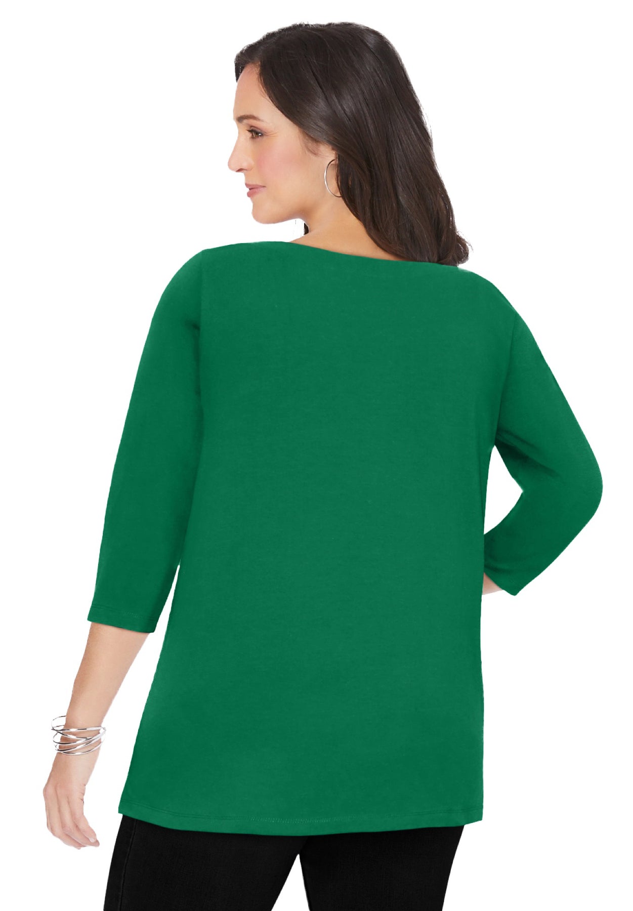 The Jessica London plus size women's three-quarter sleeve Stretch Cotton Boatneck Tunic is an everyday essential for every body, and is available in bright bold hues as well as pretty patterns and prints. The flattering relaxed fit is easy to dress up or down, and the longer tunic length eases over all of your favorite bottoms.