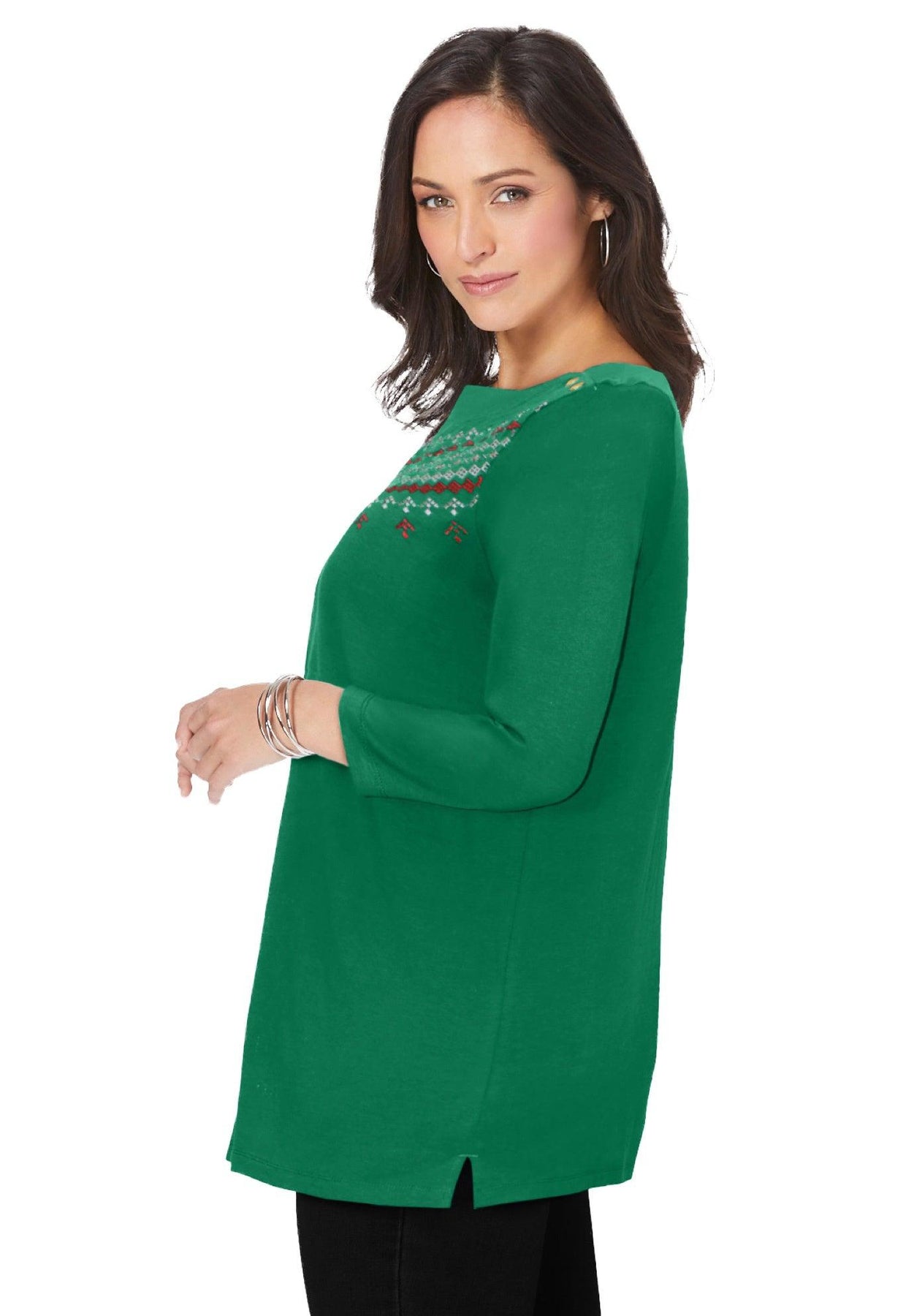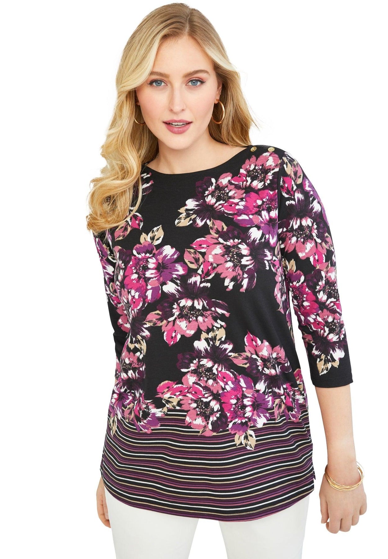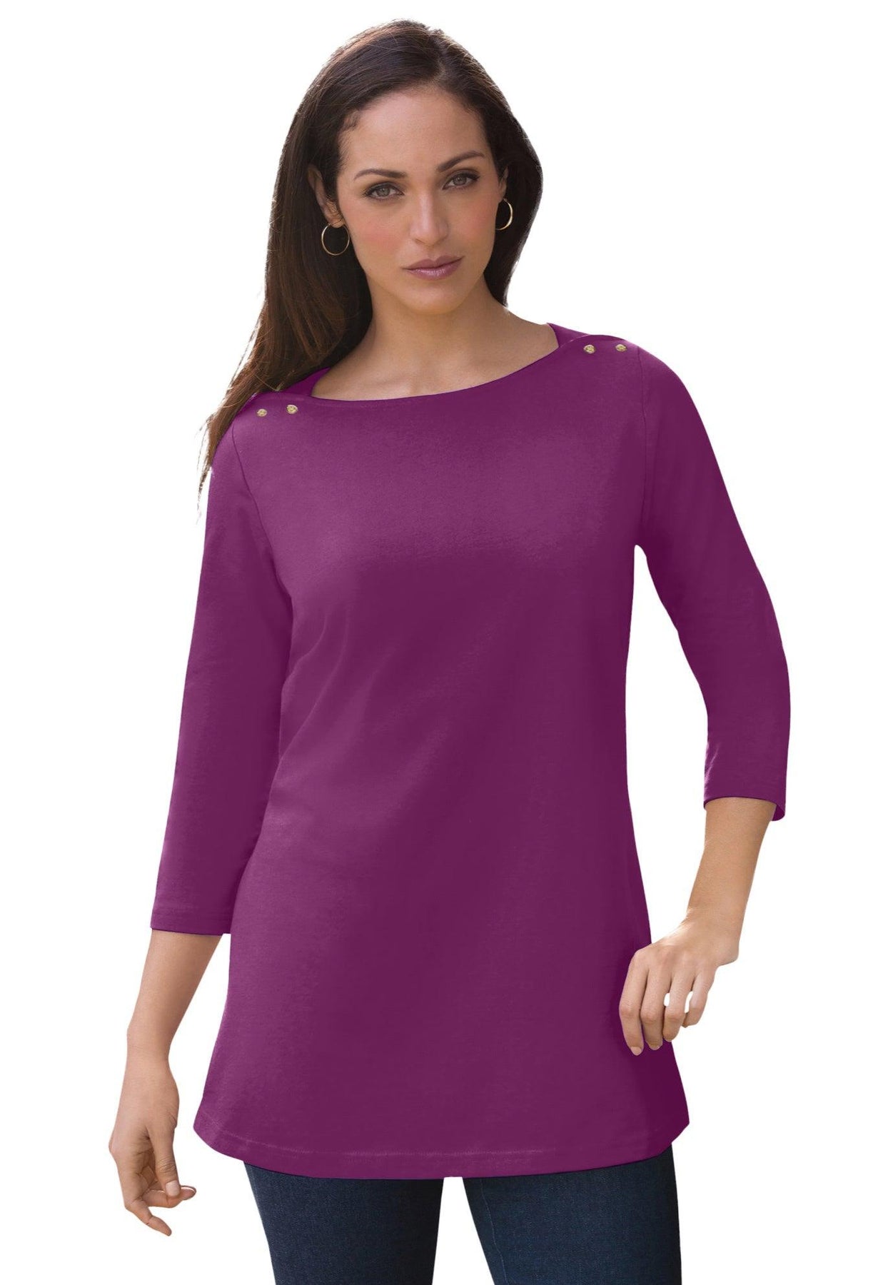 A casually sophisticated knit top with gold tone buttons on the shoulders and in the perfect length. Three-quarter sleeves. Side slits.