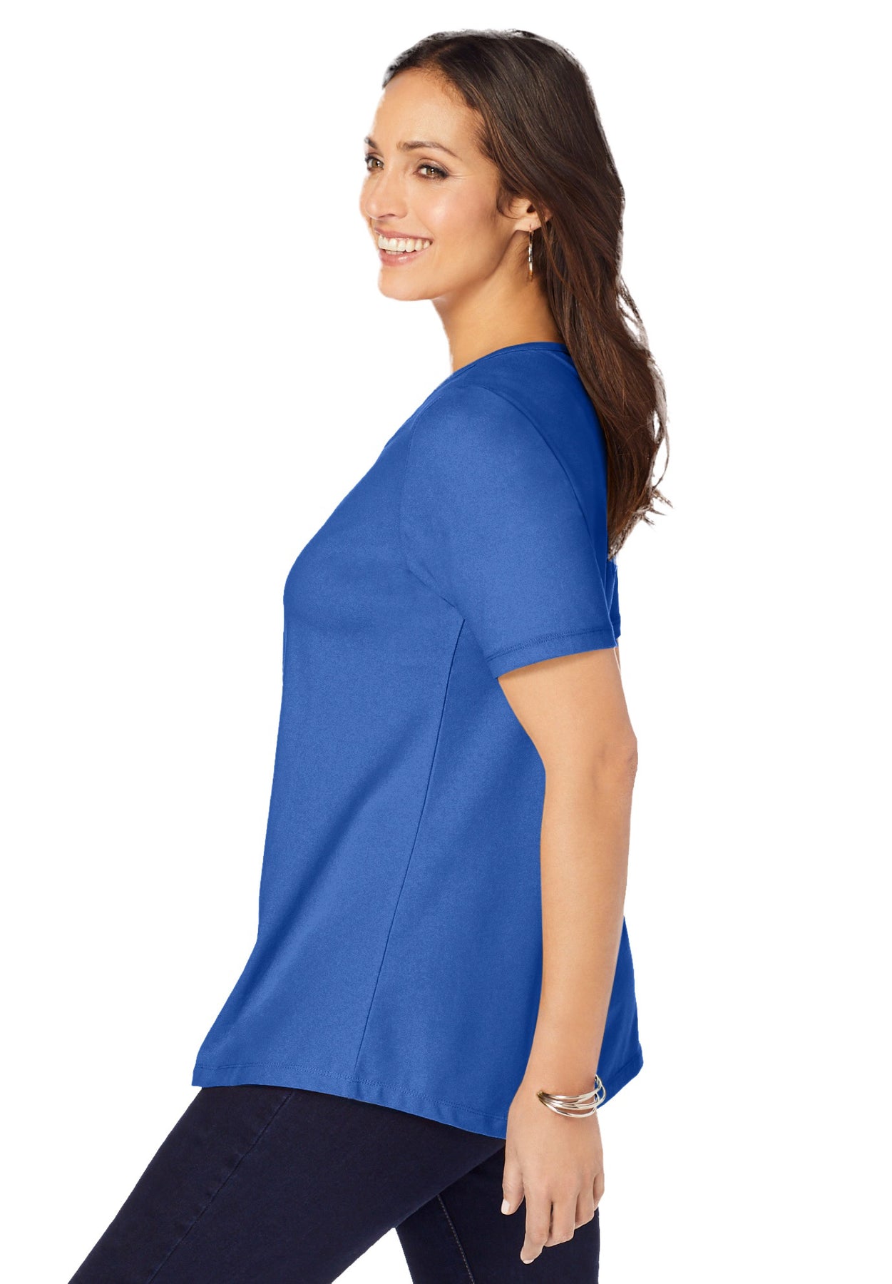 Slender straps crisscrossing the V-neckline create a focal point on a relaxed jersey tee cut in a A-line silhouette.