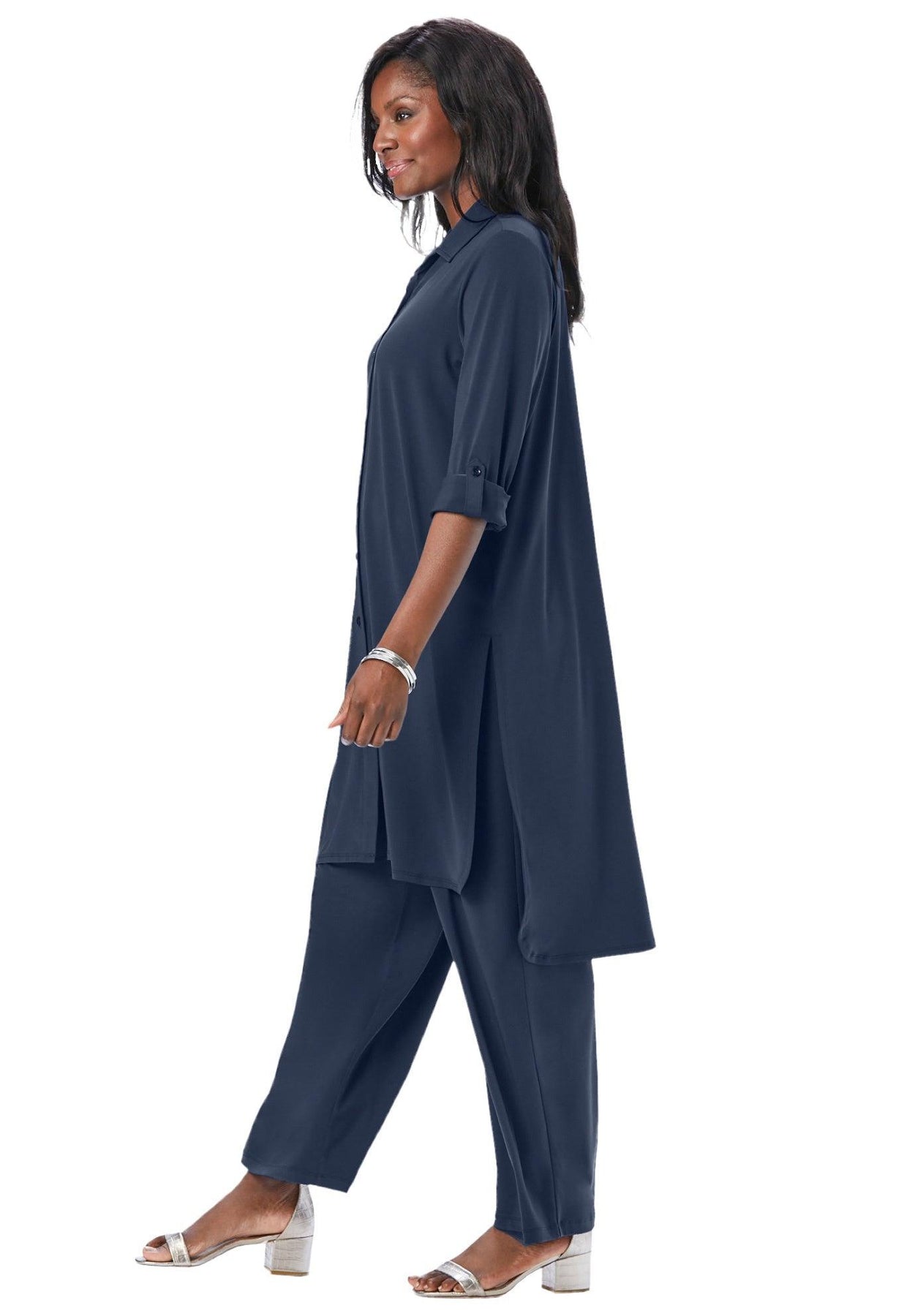 We’ve reimagined our iconic mega tunic in a luxurious stretch jersey knit that drapes beautifully, keeps its smooth shape wash after wash, and packs without wrinkling. It’s an ultra-versatile piece you can make your own by wearing it buttoned, layered over a cami or tee, or tied at the waist. Wear the roll-tab sleeves long or rolled to three-quarter length.
