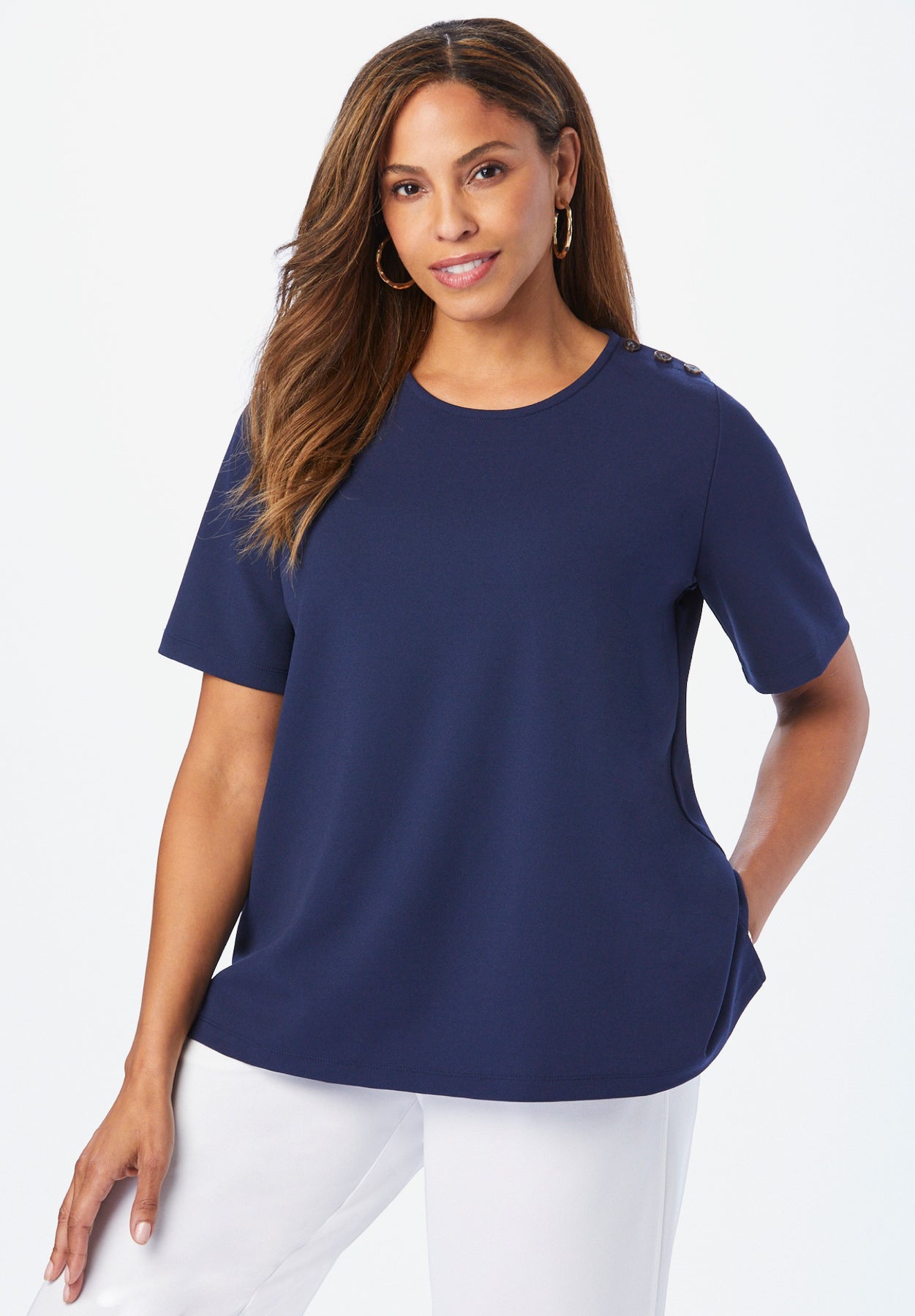 This season-spanning staple perfectly pairs with trousers and a blazer or coordinating stretch knit pieces for a look that’s equal parts comfortable and flattering. Feminine button details at the shoulders add a pop of flair to this classic fit.