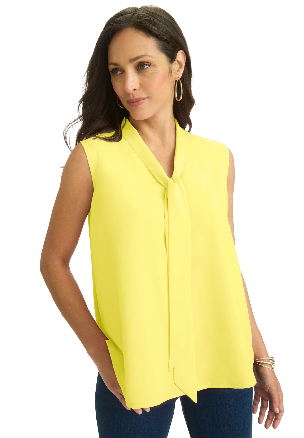 Looking for the perfect blouse to wear comfortably under blazers, jackets, and more? Your search ends here! This Tie-Neck blouse features a woven front for a polished look and a knit back for comfort. It’s the ideal combination for both work and casual style. Pair it with our True Fit Straight Leg Jeans for a winning ensemble.