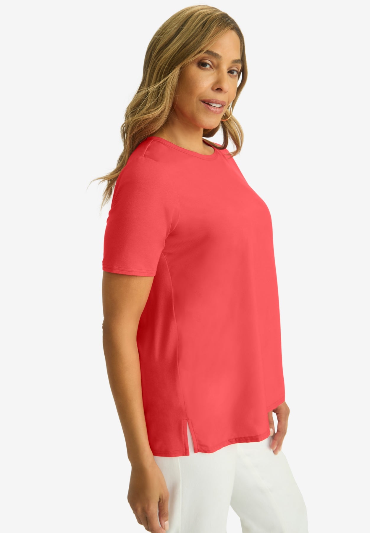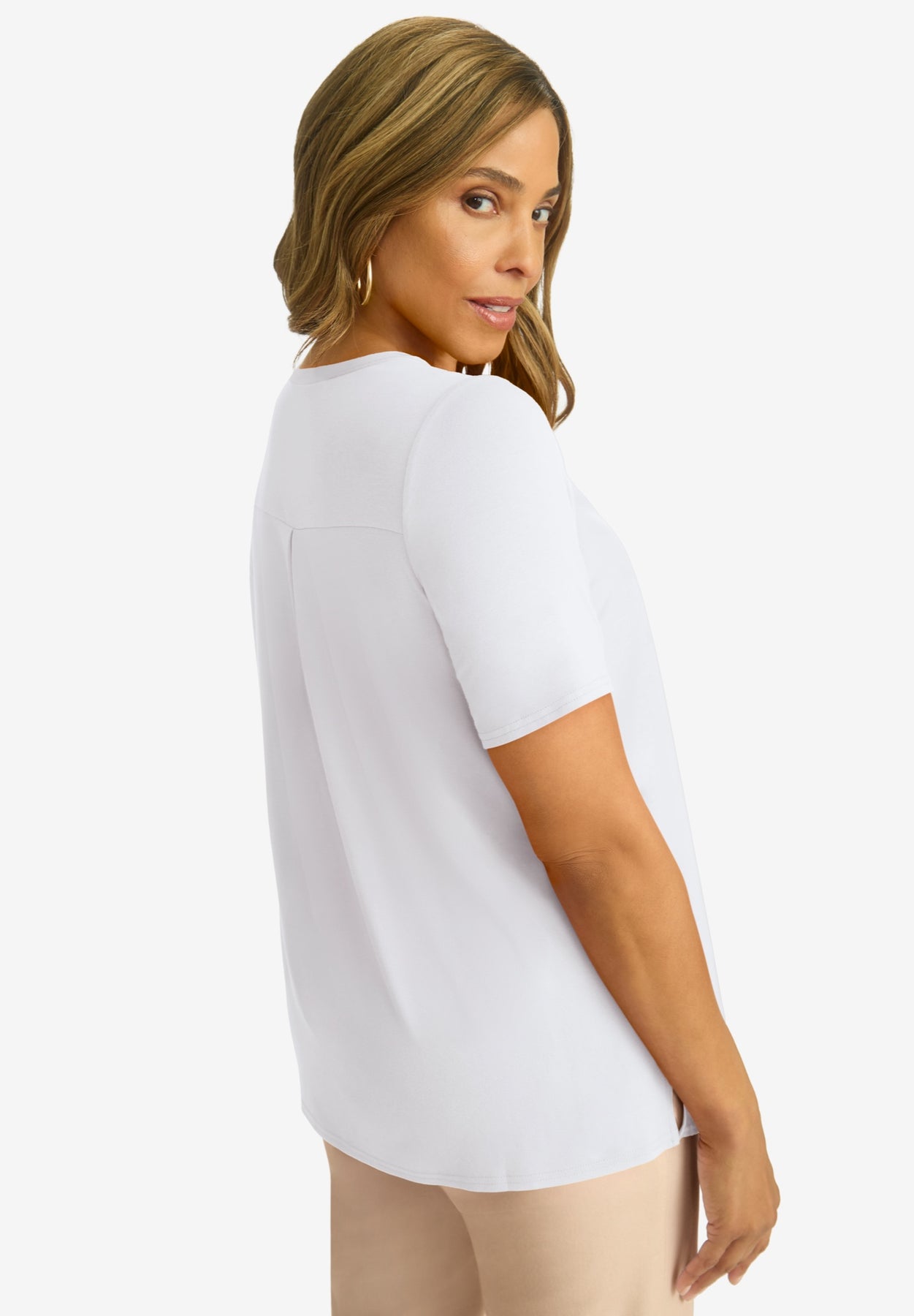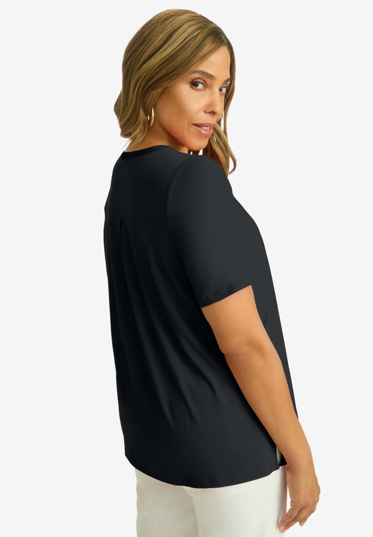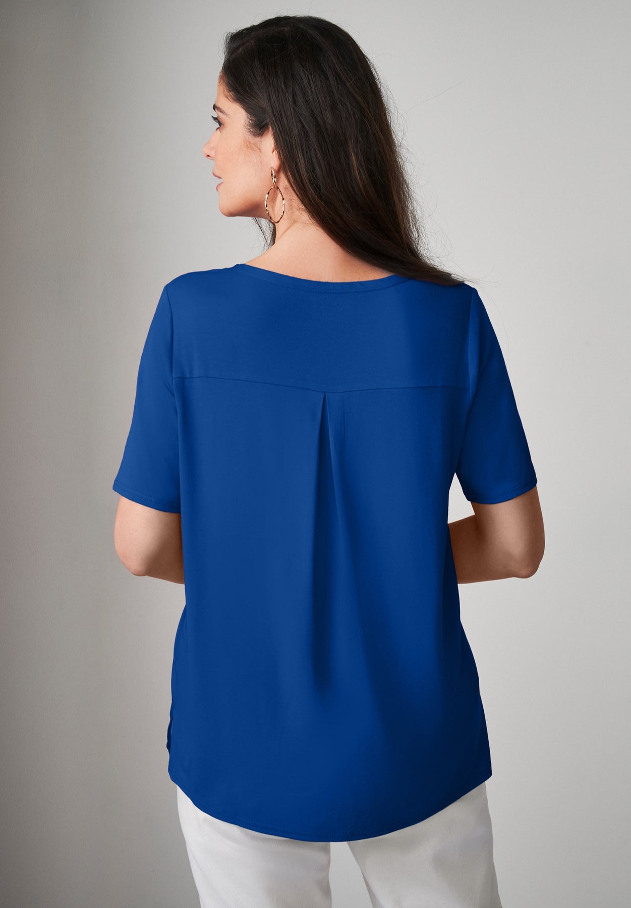 The best of both worlds in one polished tee! This style features a woven front that's perfect for when you need to be a bit more dressy than usual, and a knit back so you don't have to sacrifice comfort. Style it with our True Fit Straight Leg Jeans for a look that's as stylish as it is comfortable.