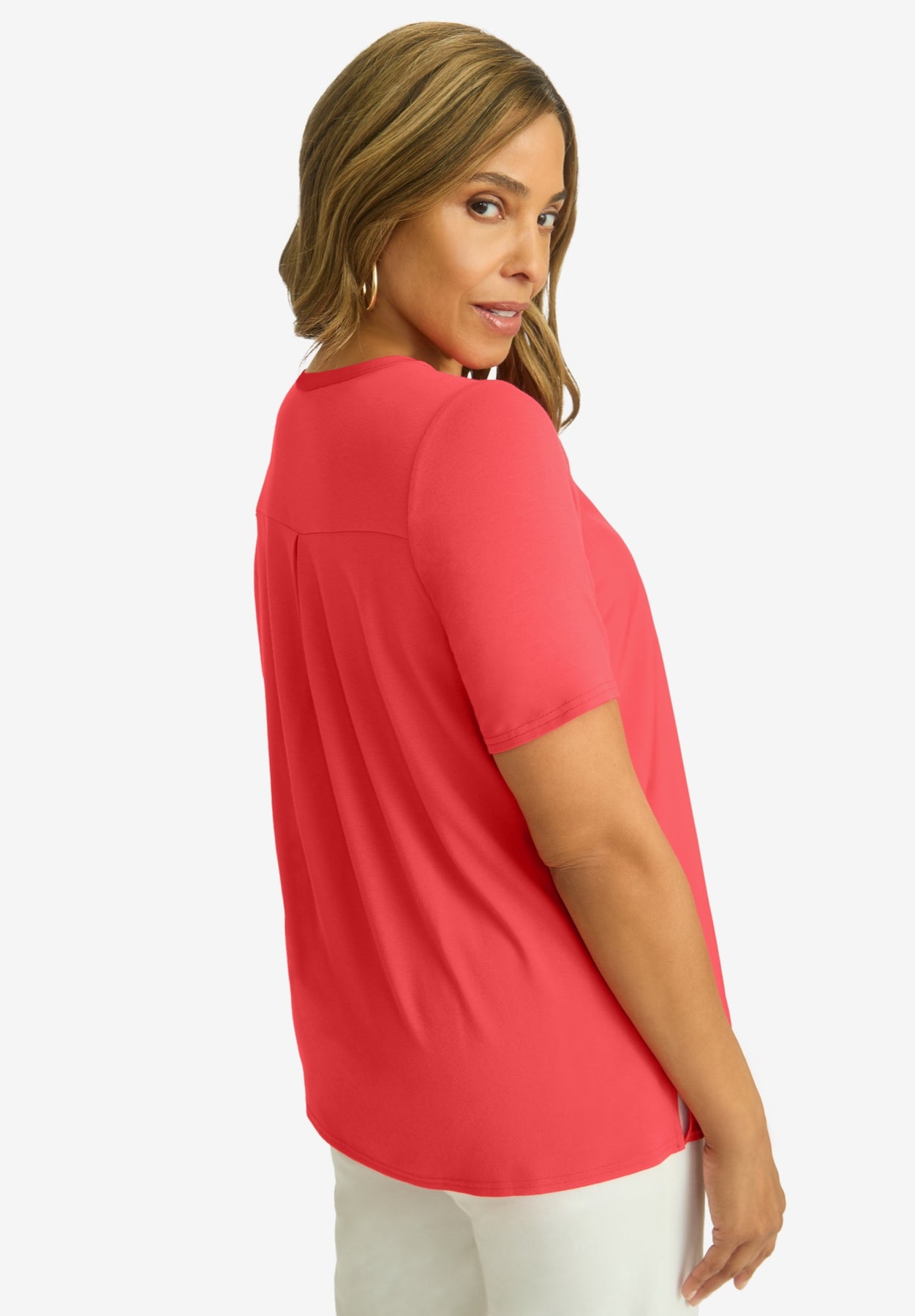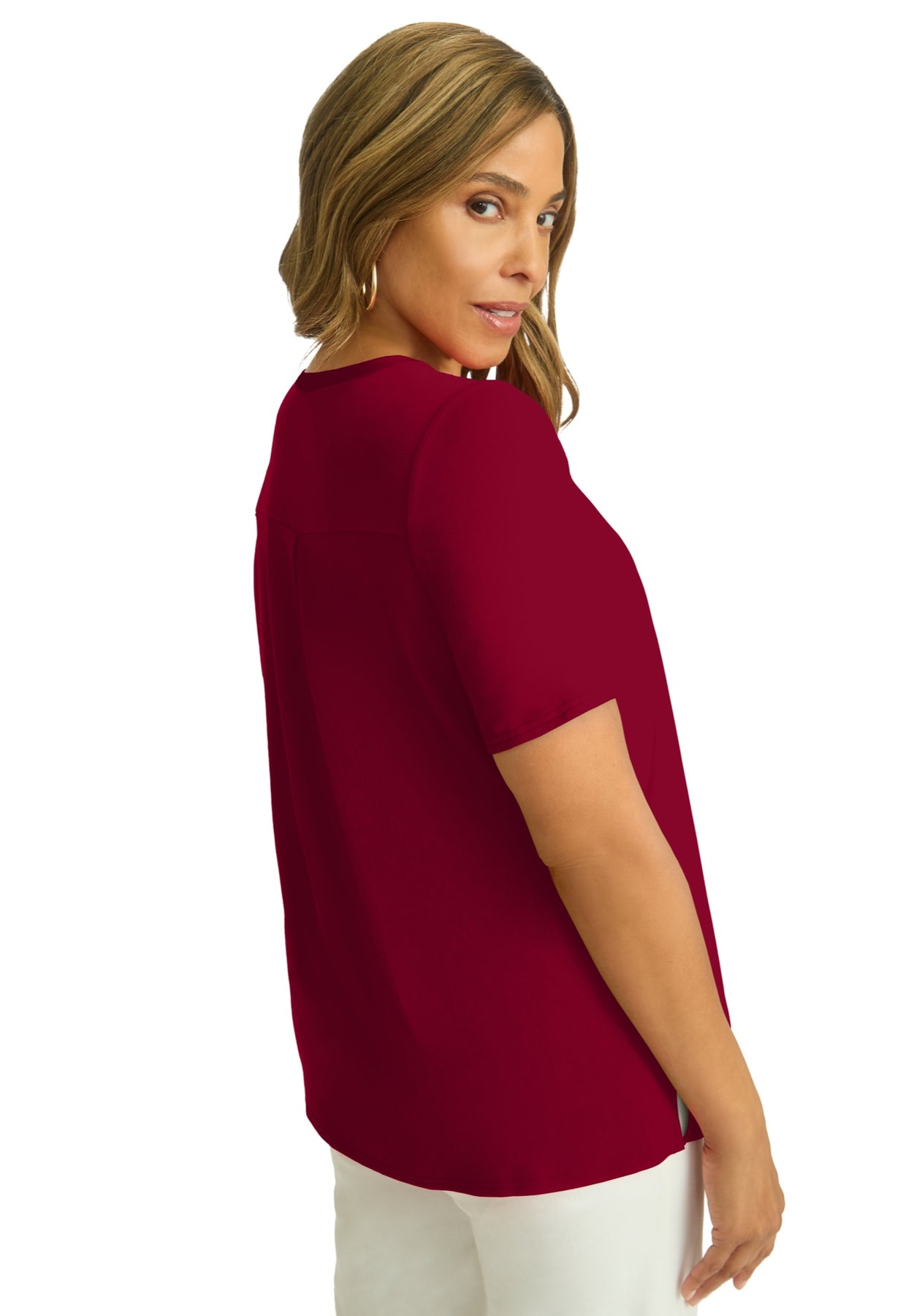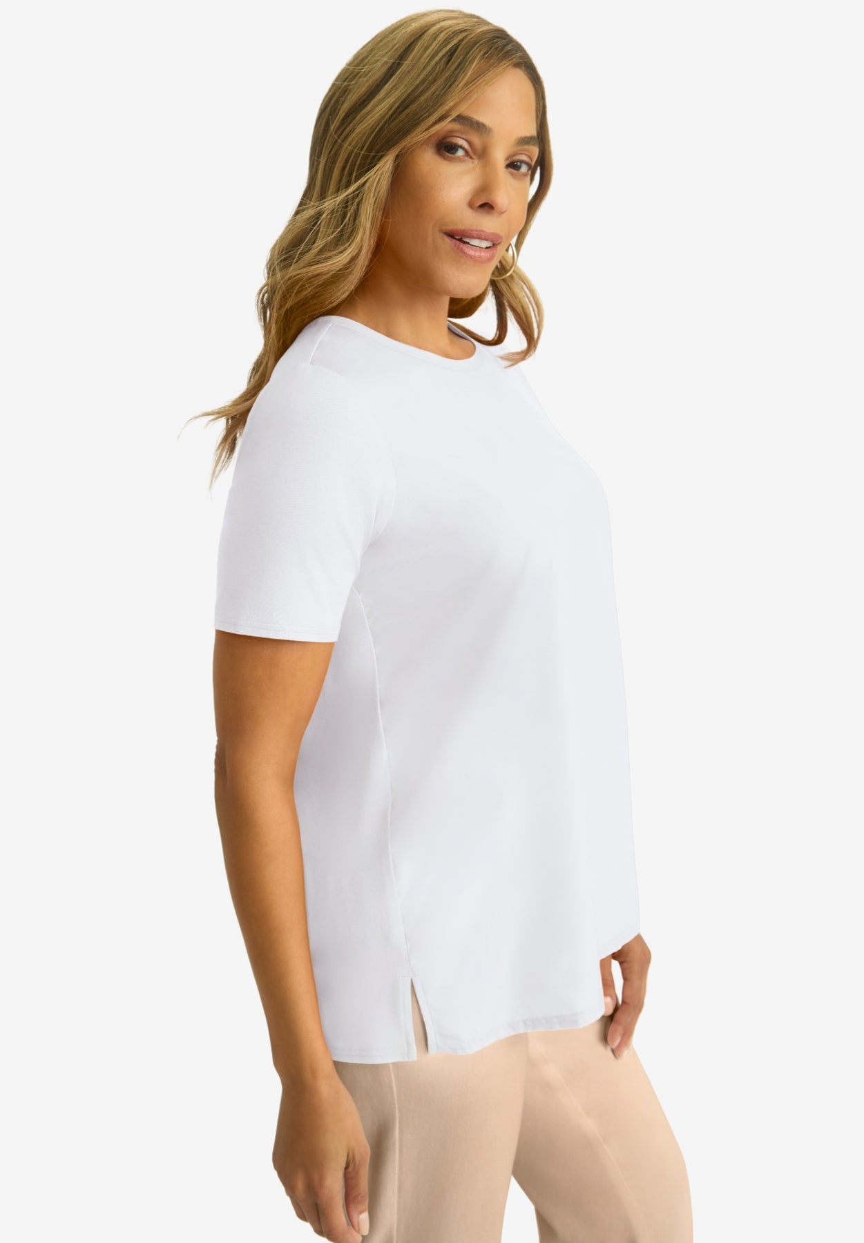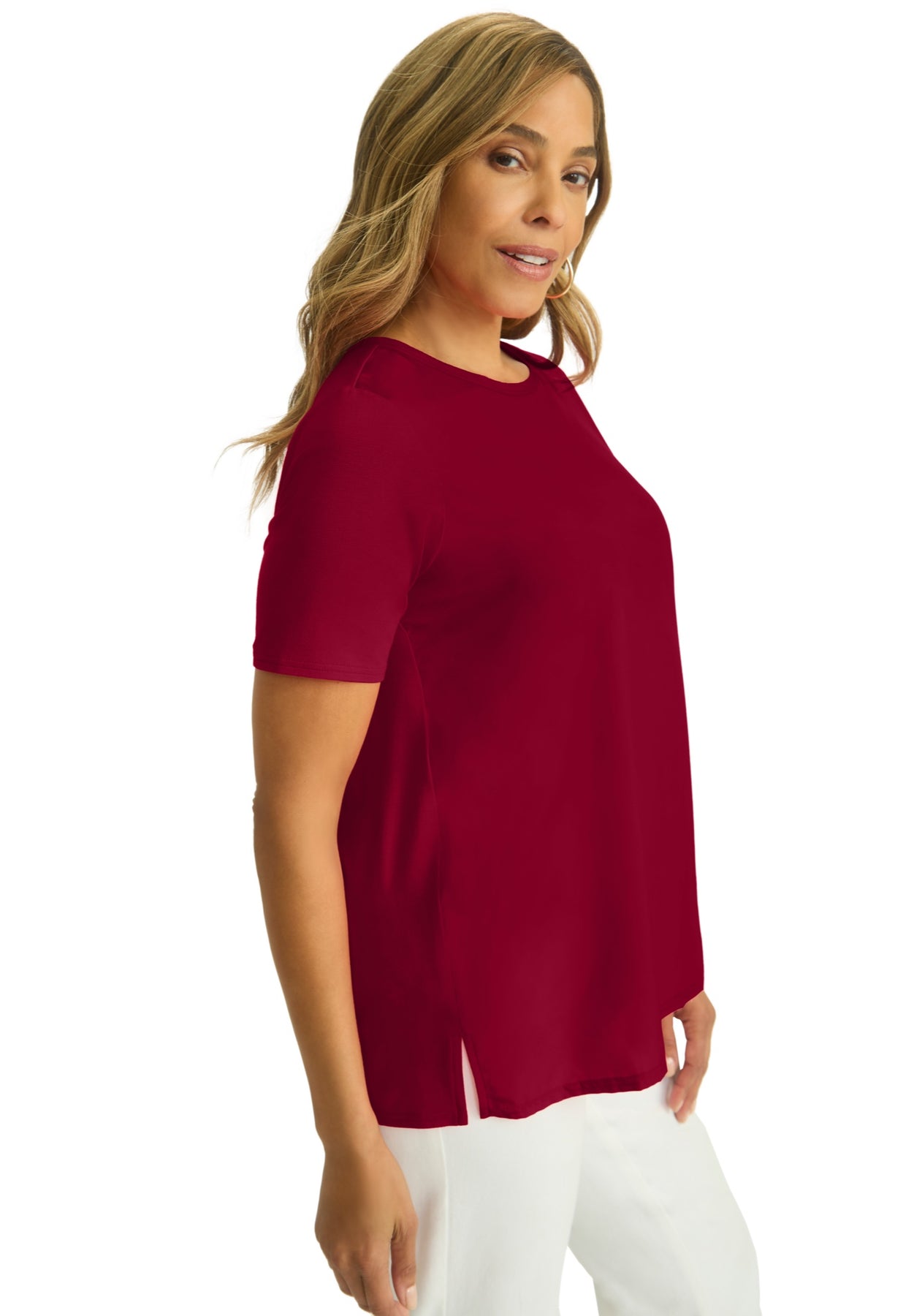 The best of both worlds in one polished tee! This style features a woven front that's perfect for when you need to be a bit more dressy than usual, and a knit back so you don't have to sacrifice comfort. Style it with our True Fit Straight Leg Jeans for a look that's as stylish as it is comfortable.
