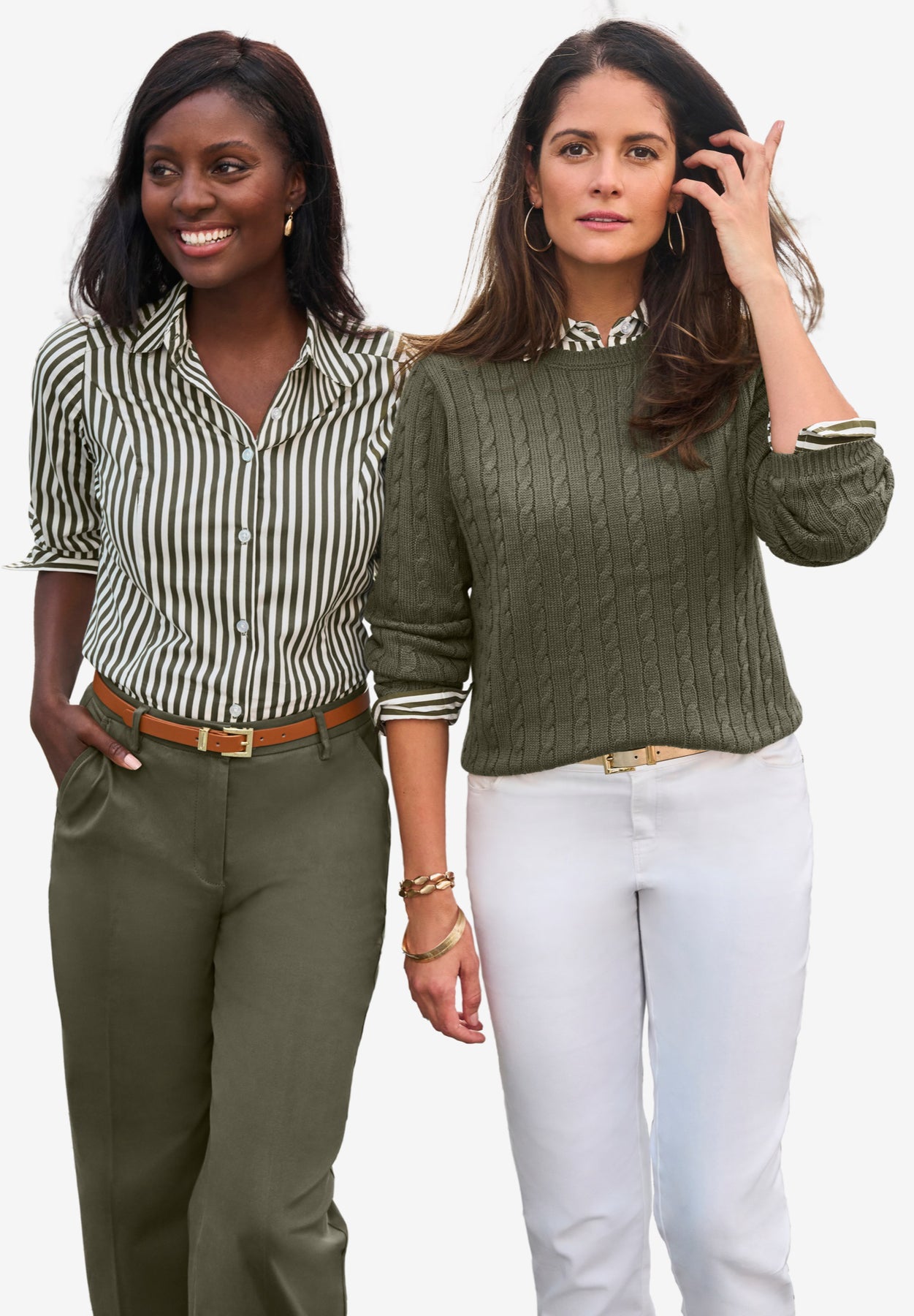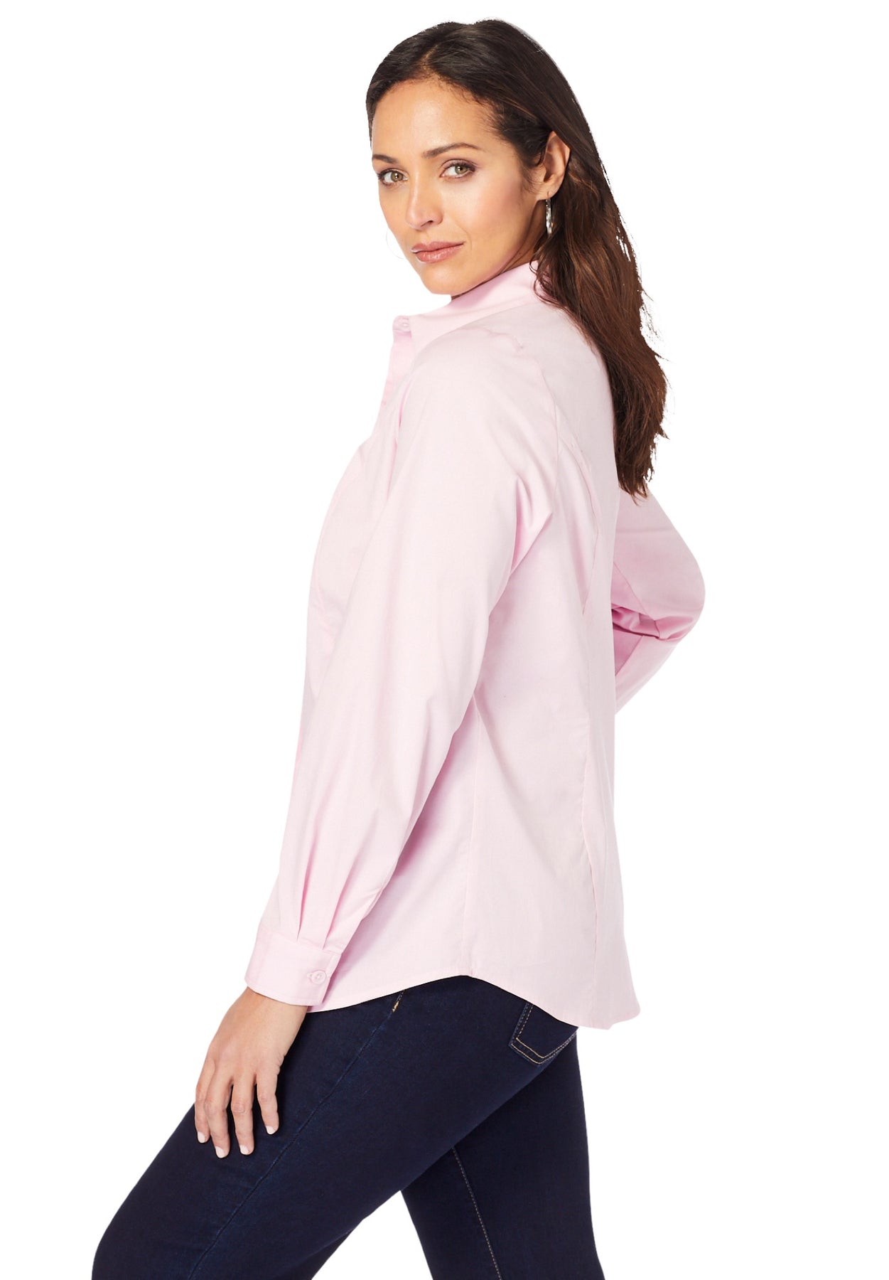 This polished poplin update is a versatile wardrobe essential that pairs perfectly with everything from suits and skirts to jeans and leggings. It's comfortable yet tailored fit is extremely flattering and the stylish shirt collar and button-cuff add a sophisticated finish.