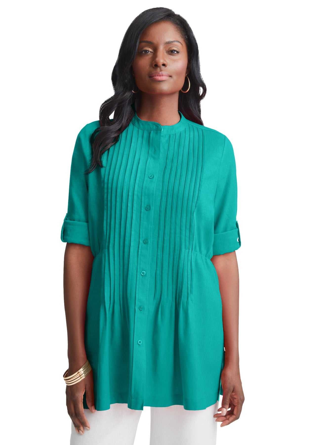 This fit-and-flare linen tunic adds timeless style to dress up all your favorite bottoms. Long sleeves feature roll-back tabs so you can cuff them for a casual look.