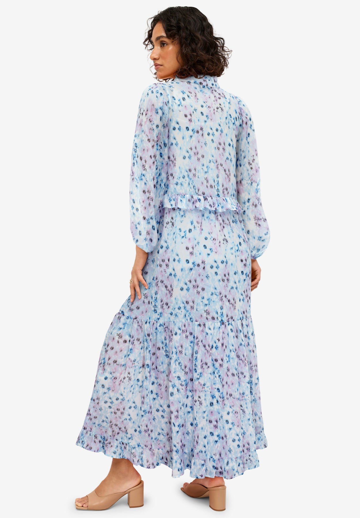 This dress has peak summer style featuring a V-shaped empire waist, tiered skirt, below-elbow sleeve and ruffled trim. A detachable knit slip layers under the light and airy chiffon. Paired with your favorite summer sandals it makes the perfect summertime event dress.