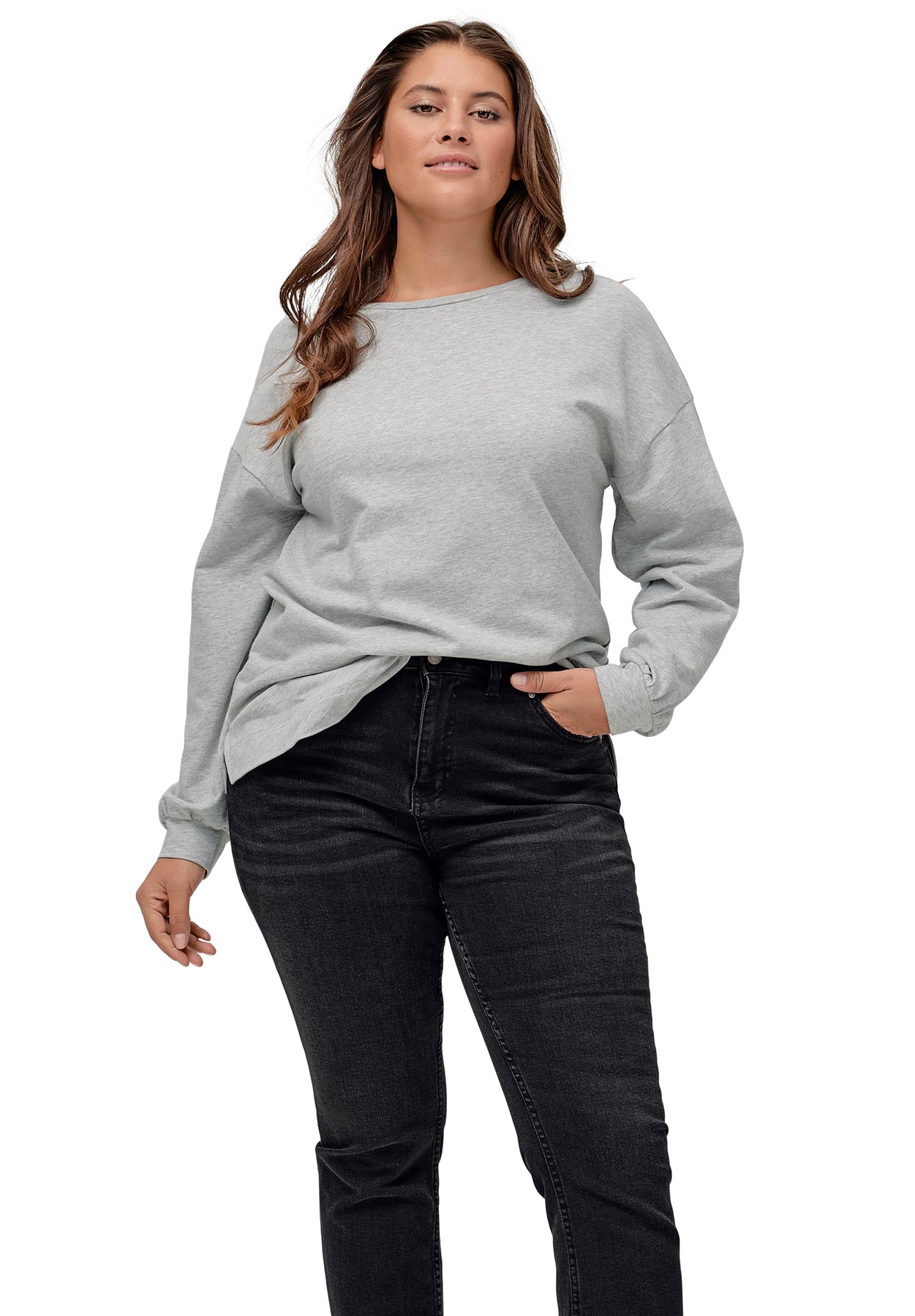 - Long sleeves with slight blouson & soft shirring at ribbed sleeve cuff