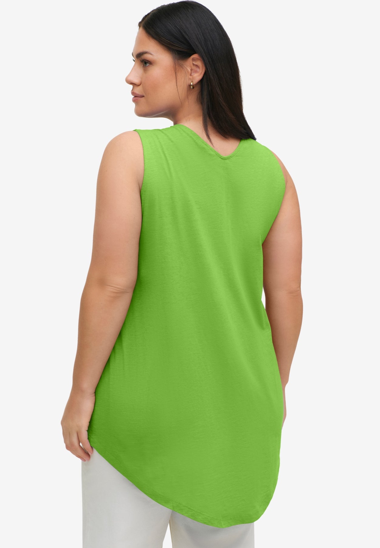 Easily the prettiest tank of the season with a free-flowing A-line silhouette enhanced with an inverted front pleat. The hem has a soft, high-low curved shape that further softens the look.