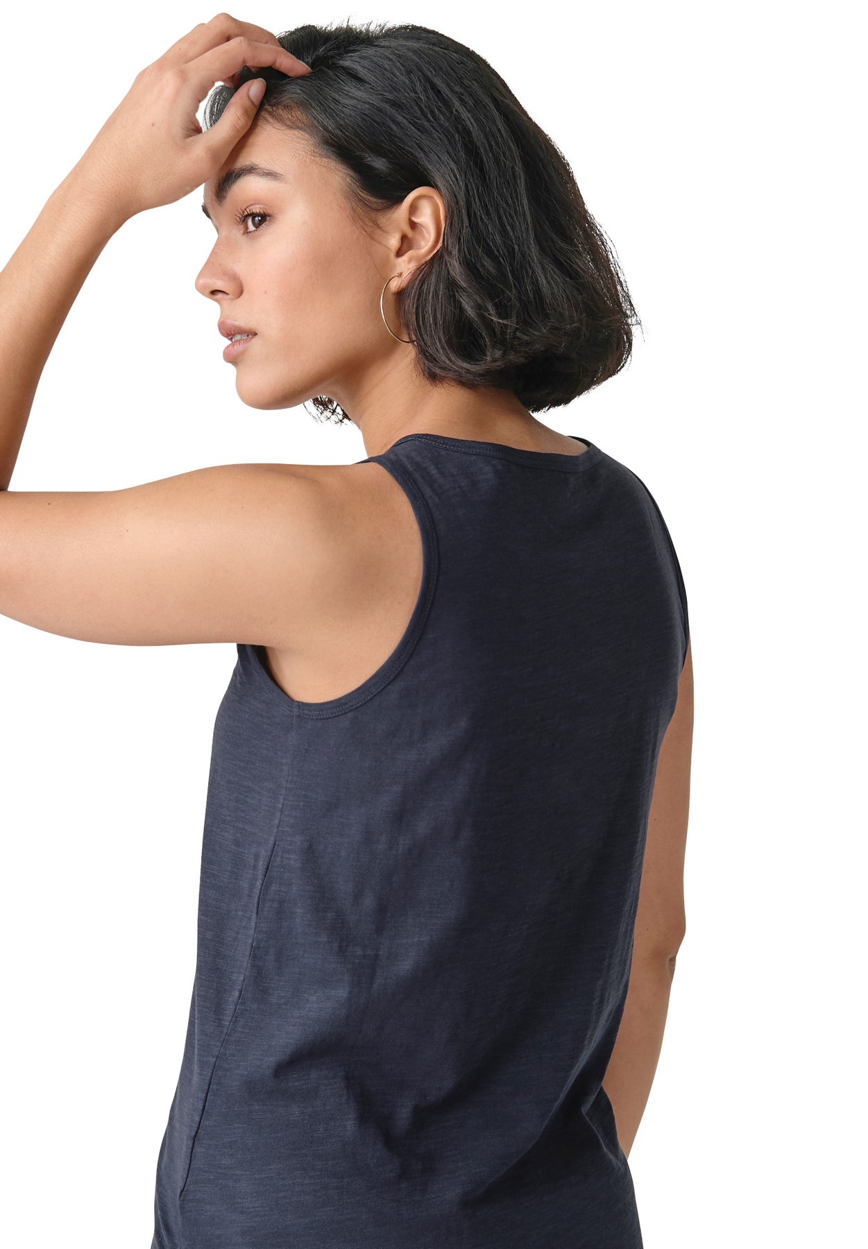 Sleeveless knit Henley tank in an A-line shape with scoop neckline. Silver metal buttons along front placket. Curved hem with side slits.