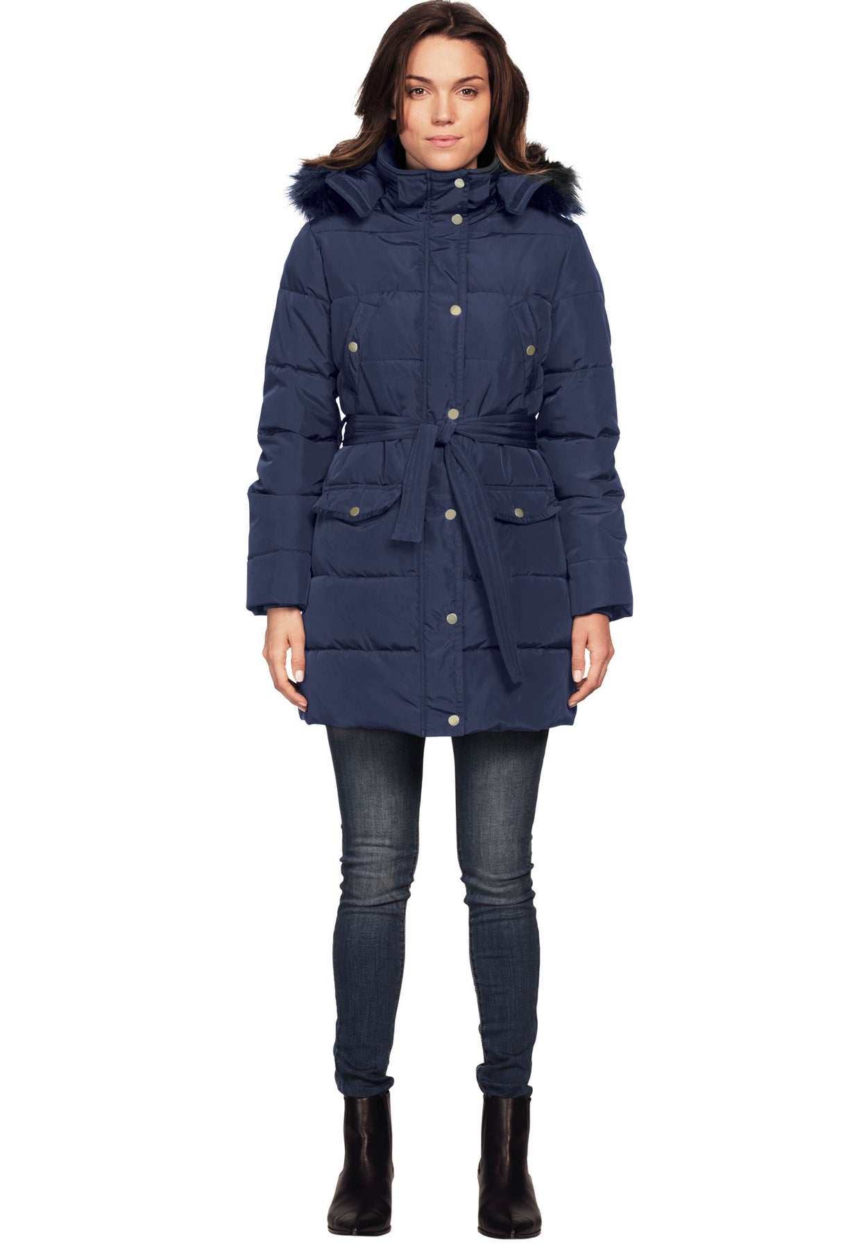 Puffer coat with self sash belt. Zip/snap front placket with ribbon tape trimmed edge. Ribbed trim collar. Removable zip-off hood with removable faux fur trim. Long sleeves with inner ribbed cuffs. Diagonal snap breast pockets and front patch pockets lined with dyed-to-match fleece. Polyfill lined for warmth. Water-resistant.