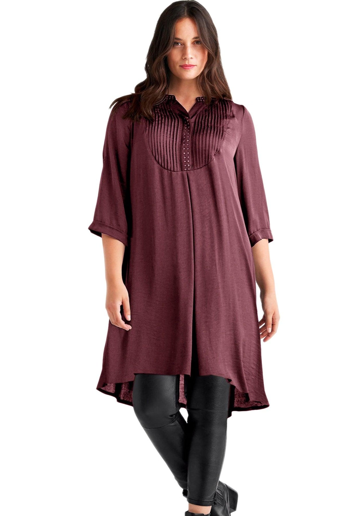 V-neckline with snap closure and pintucking. Decorative stud details at collar and placket. Roll-up sleeves with snaps. Inverted front and back pleats. High/low rounded hem with side slits.