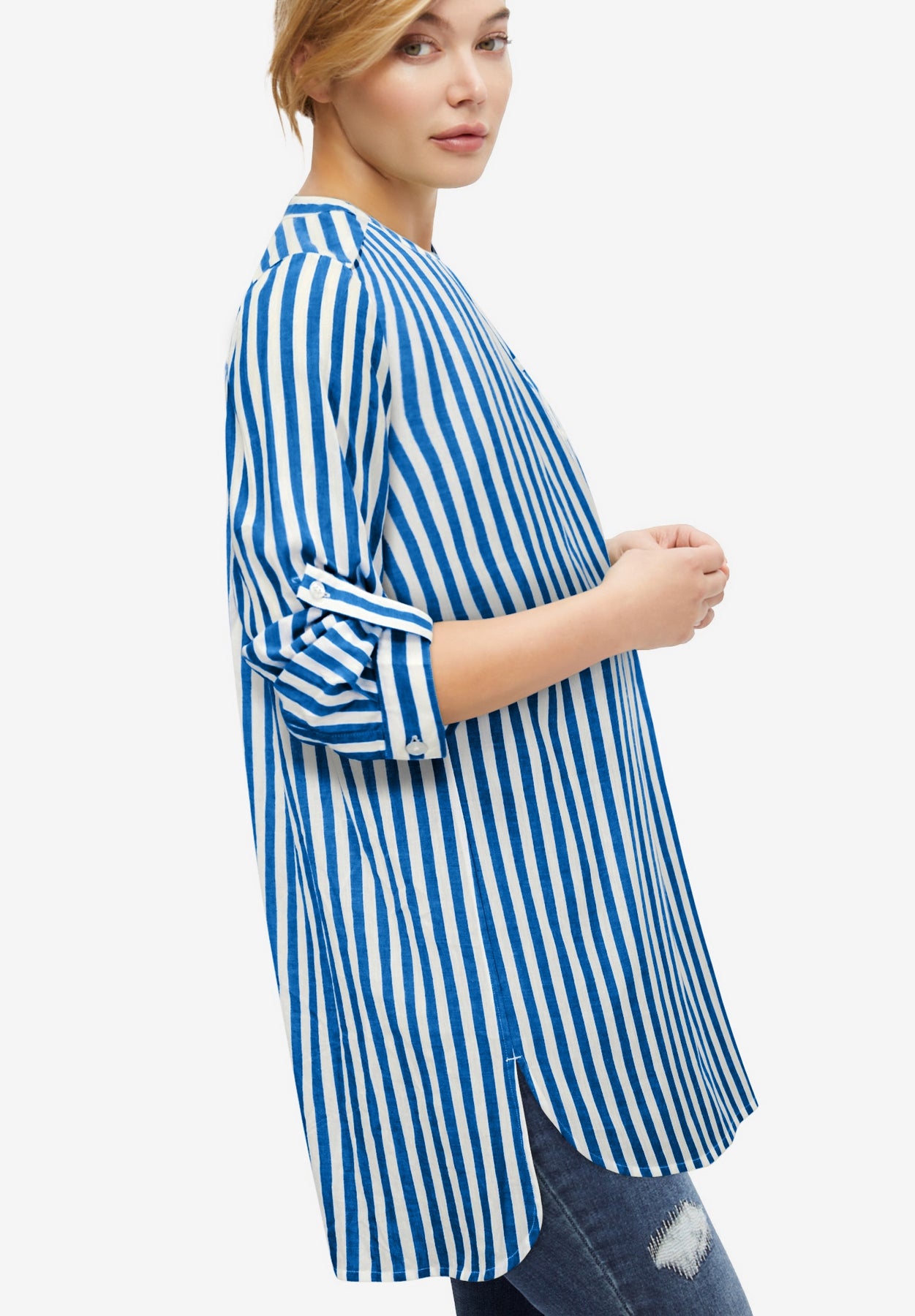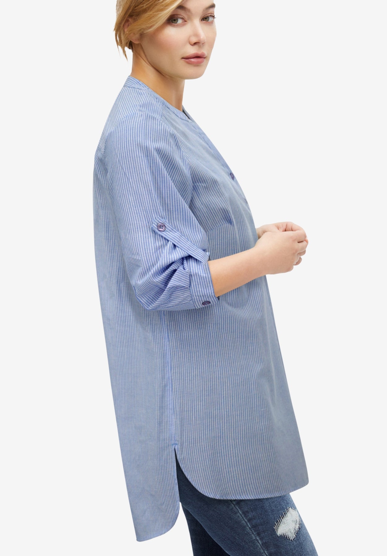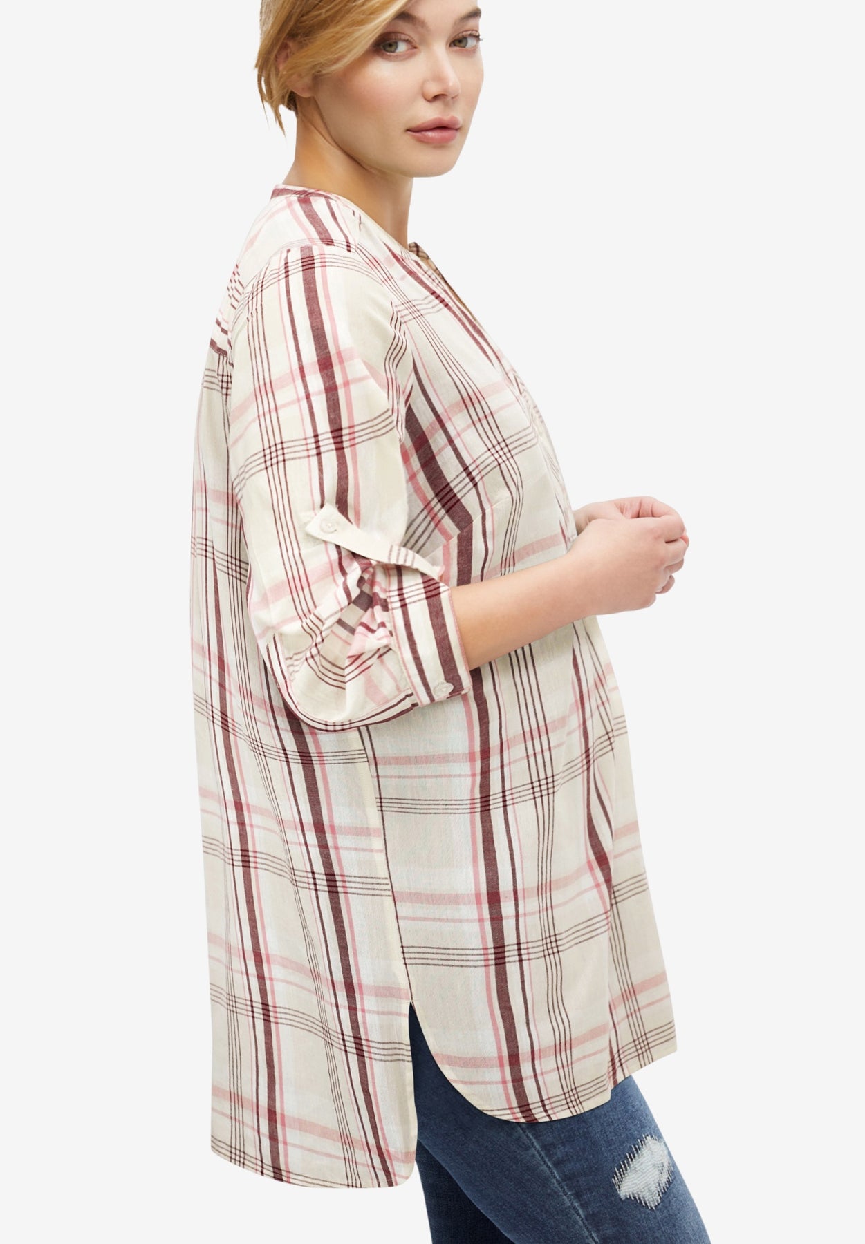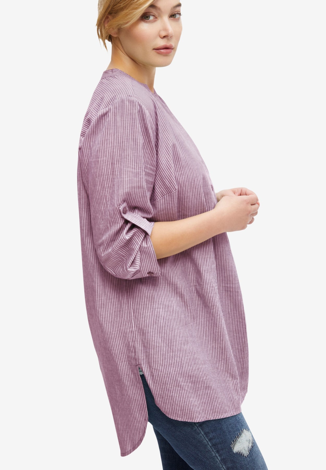 DETAILS: The Three-Quarter Sleeve Roll Tab Relaxed Fit 100% Cotton Plus Size Women's Henley Tunic is an easy, lightweight must-have for all seasons. It's fashioned with a stylish Henley neckline, three-quarter roll-tab sleeves to wear rolled or unrolled and center back pleat. The relaxed silhouette pairs perfectly with skinny jeans or leggings for casual-cool outfits that feel put together.
