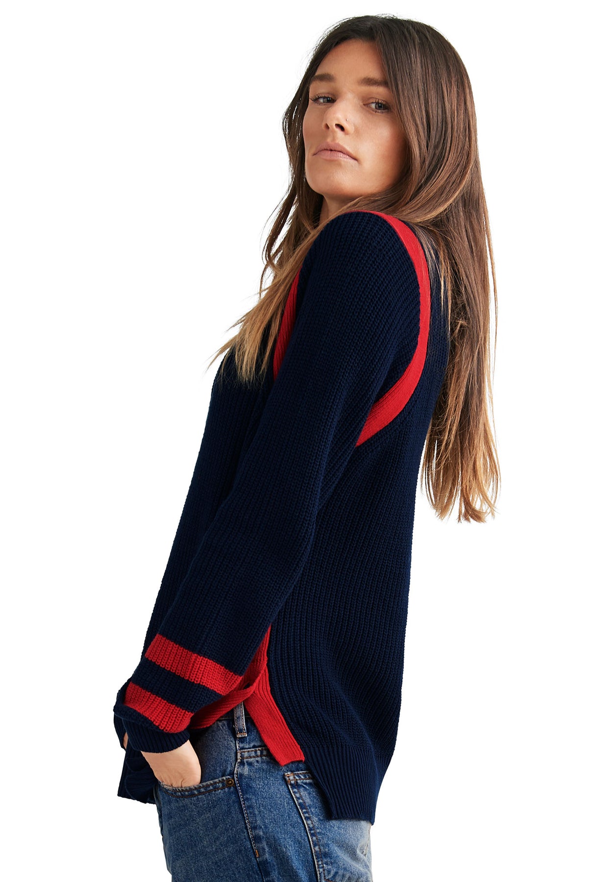 Varsity-inspired contrast stripes trim the edges of this ribbed knit pullover create a sporty-chic look.