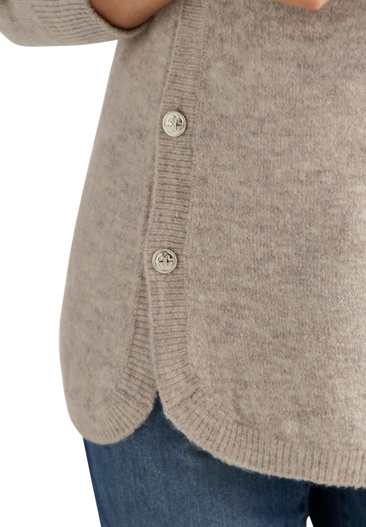 It's the little modern details - Silver buttons on the sides of this ribbed trim sweater make it a must-have.