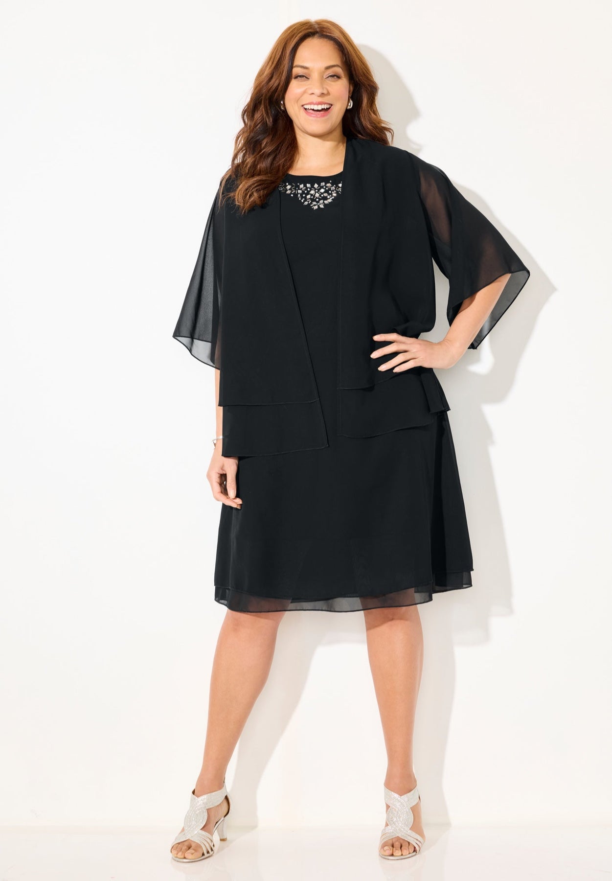 Effortlessly chic and undeniably stylish, this double layer woven dress and jacket set is ready to take you to any occasion where beauty and comfort are key. The dress features a jewel neckline adorned with delicate embellishment and has a soft denier lining for a luxurious feel.